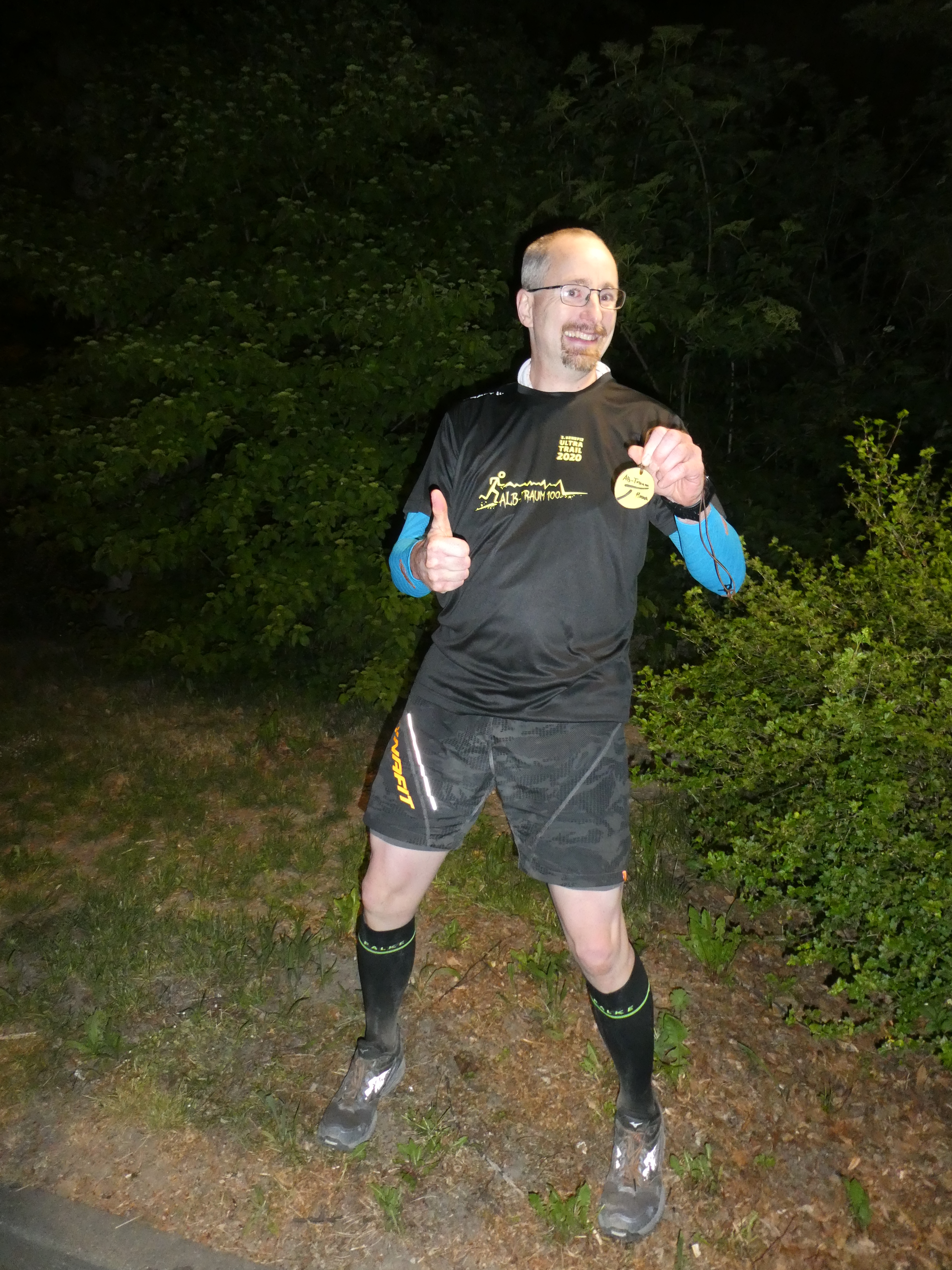 Nachts um halb eins mitten auf der Schwäbischen Alb: Der Schönaicher Extremläufer Ralf Kuppinger freut sich über die vom Vorsitzenden des Alb-Traum100-Vereins persönlich überreichte Ehrenmedaille.