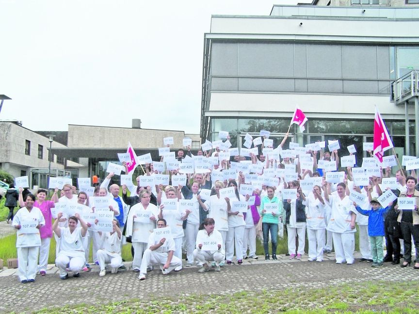 Rund 70 Mitarbeiter des Sindelfinger Krankenhauses halten große Zahlen in die Luft. Das Treffen ist ein Vorgriff auf den bundesweiten Aktionstag der Gewerkschaft Verdi am Mittwoch. „162 000 Kollegen fehlen ...