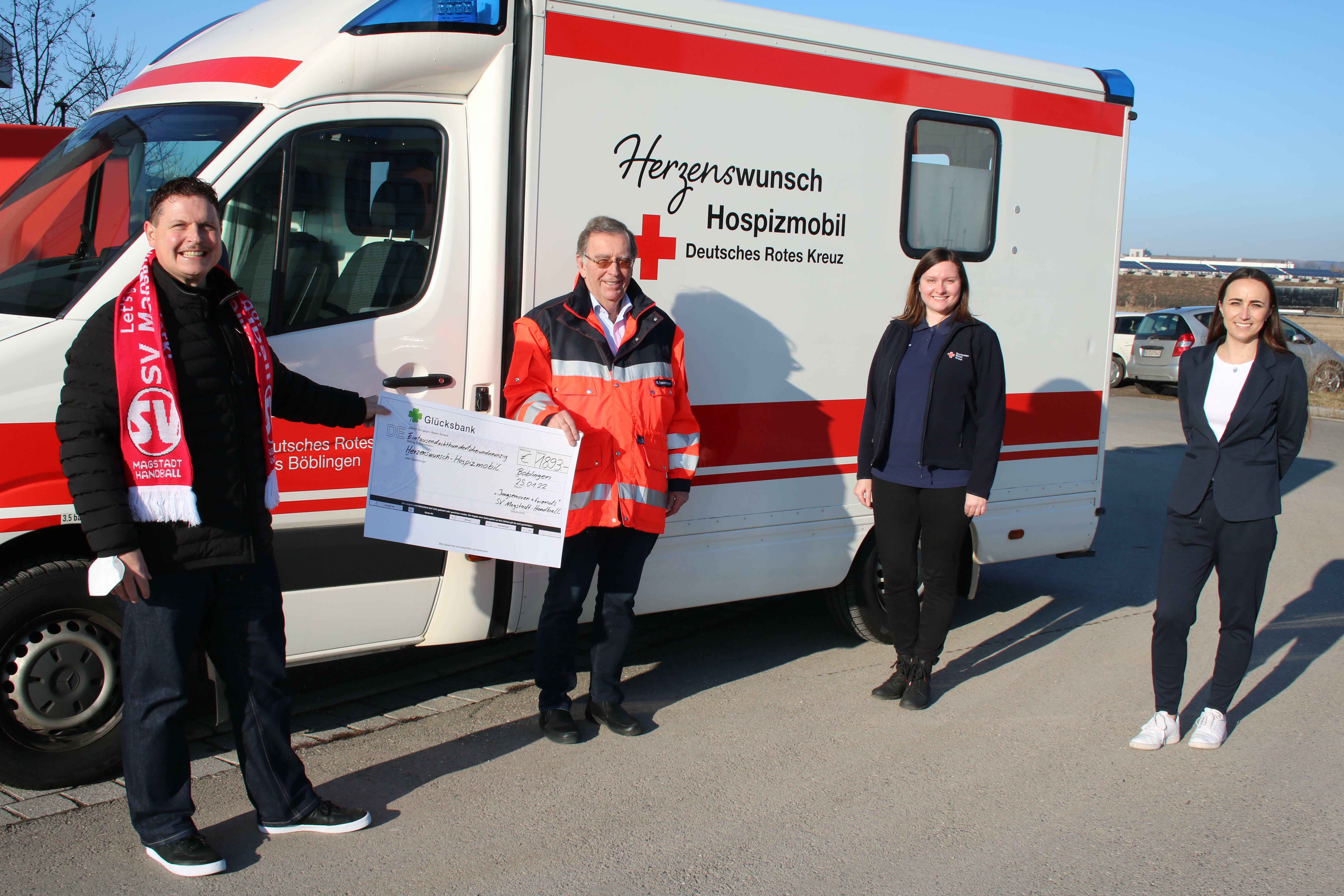 Die Spende wurde von Ralf Schmid, ehemaliger Handball-Aktiver und zweiter Vorsitzender des SV Magstadt, im DRK-Zentrum auf dem Flugfeld Böblingen-Sindelfingen an Michael Steindorfner, den Präsidenten des DRK-Kreisverbandes Böblingen, übergeben. An der kleinen Übergabezeremonie vor dem Herzenswunsch-Hospiz-Mobil nahmen auch die beiden Ehrenamtlichen des DRK-Organisations-Teams für das Herzenswunsch-Hospiz-Mobil, Sonja Hein und Catherina Doppke, teil
