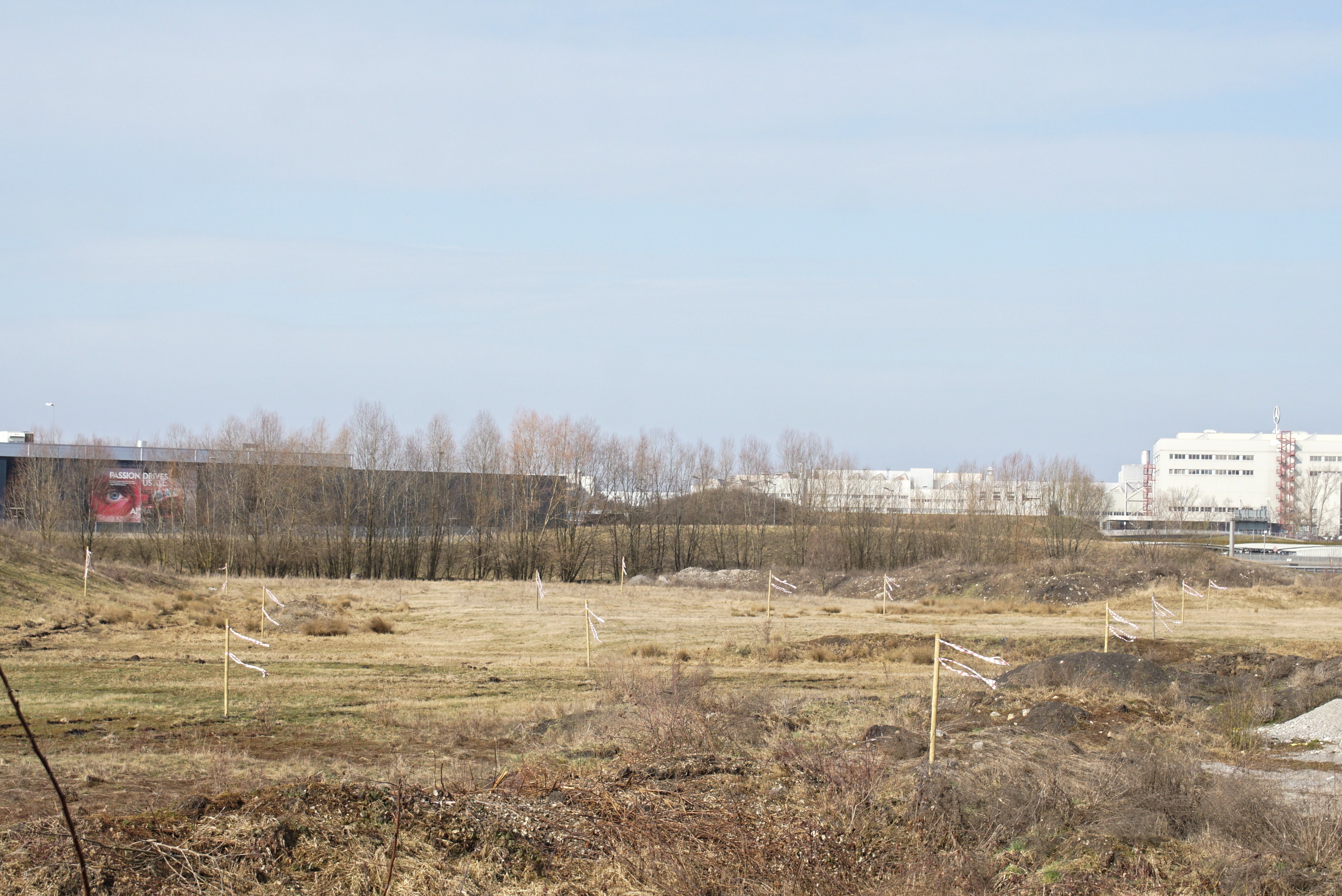 Geht's jetzt los mit dem neuen Autobahnanschluss Böblingen/Sindelfingen auf dem Flugfeld? Holzpflöcke, die zwischen Autobahn und der Flugfeldallee in den Boden geschlagen und mit rot-weißen Flatterbändern ...