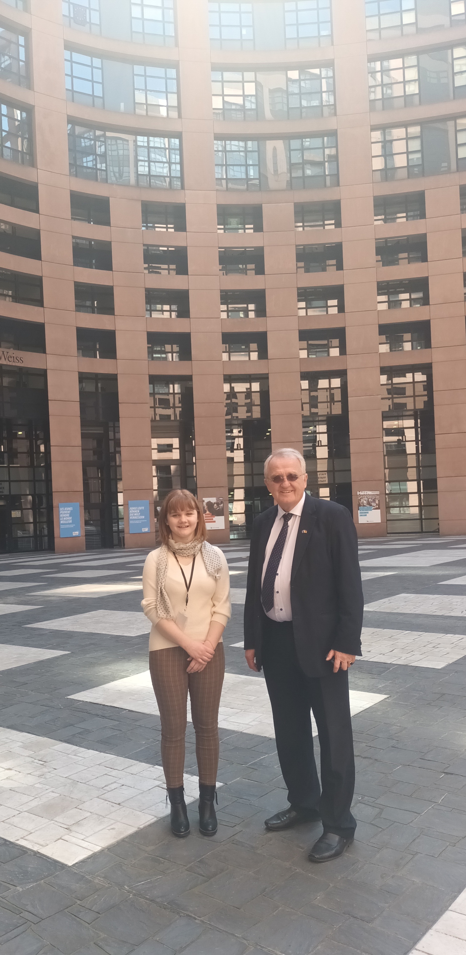Amelie Giehle und Rainer Wieland vor dem Europaparlament in Straßburg. Bild: z
