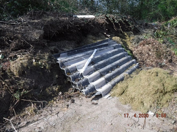 Der Arbeitsbereich Gewerbe und Umwelt des Polizeipräsidiums Ludwigsburg (Telefon 07031 / 13-2500) sucht Zeugen zu einer illegalen Abfallentsorgung. In der Steinwerkstraße in Ehningen hinterließen bislang unbekannte Täter auf einem Häckselplatz mehrere Asbestplatten. Die unerlaubte Abfallbeseitigung wurde am vergangenen Freitag gegen 8 Uhr durch einen Mitarbeiter des Abfall-Wirtschaftsbetriebes des Landratsamtes Böblingen entdeckt. Es handelt sich um acht asbesthaltige Wellfaserzementplatten, die jeweils etwa einen auf zwei Meter messen (Bild: Polizei). Mutmaßlich wurden die Abfälle mit einem größeren Fahrzeug an ihren Entsorgungsort transportiert.