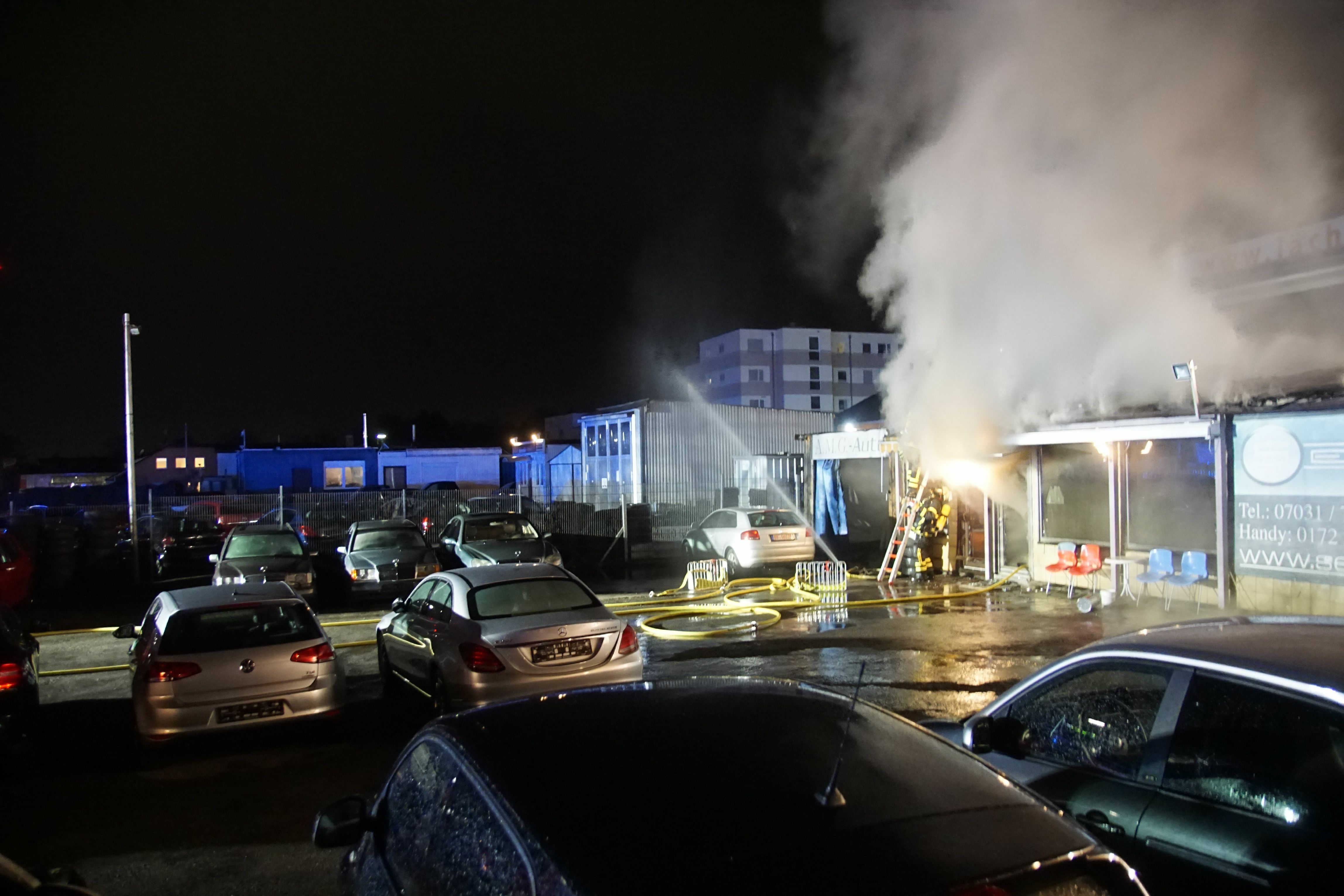 Aus bislang ungeklärter Ursache brannte heute Abend der Verkaufscontainer eines Autohändlers in der Sindelfinger Schwertstraße. Der Brand erfasste den ganzen Verkaufscontainer. Die Feuerwehr Sindelfingen war mit einem Großaufgebot vor Ort. Nach ersten Erkenntnissen der Polizei gab es keine Verletzten. Weiter Informationen liegen noch nicht vor.⋌