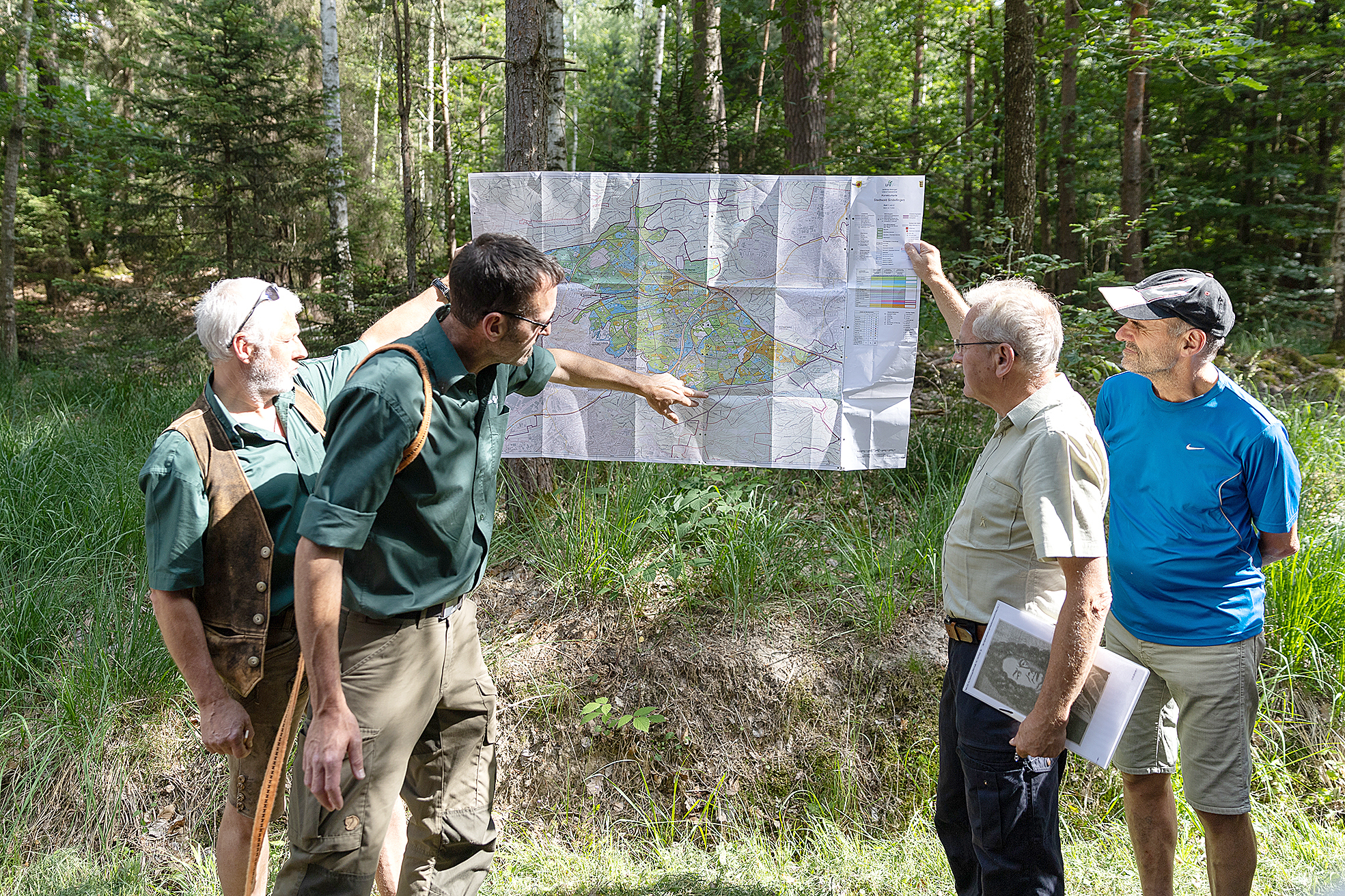 Als Förster sind Joachim König (links) und Markus Klas (Zweiter von links) täglich im Stadtwald Sindelfingen unterwegs.