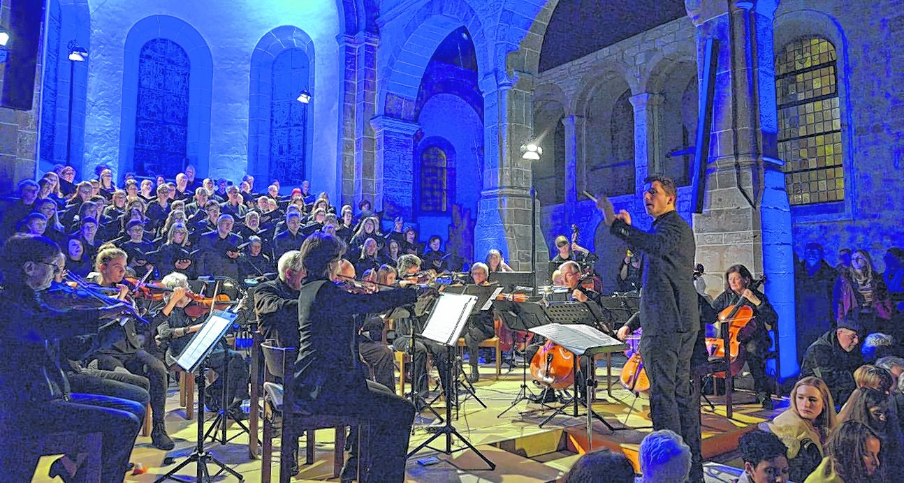 Bezirkskantor Daniel Tepper dirigiert in der Martinskirche seine Chöre und das Stiftshoforchester bei der „Sunrise Mass“ des Norwegers Ola Gjeilo. Die Messe ist im Repertoire der Sindelfinger Ensembles bei der Georgien-Reise. Bild: Stampe