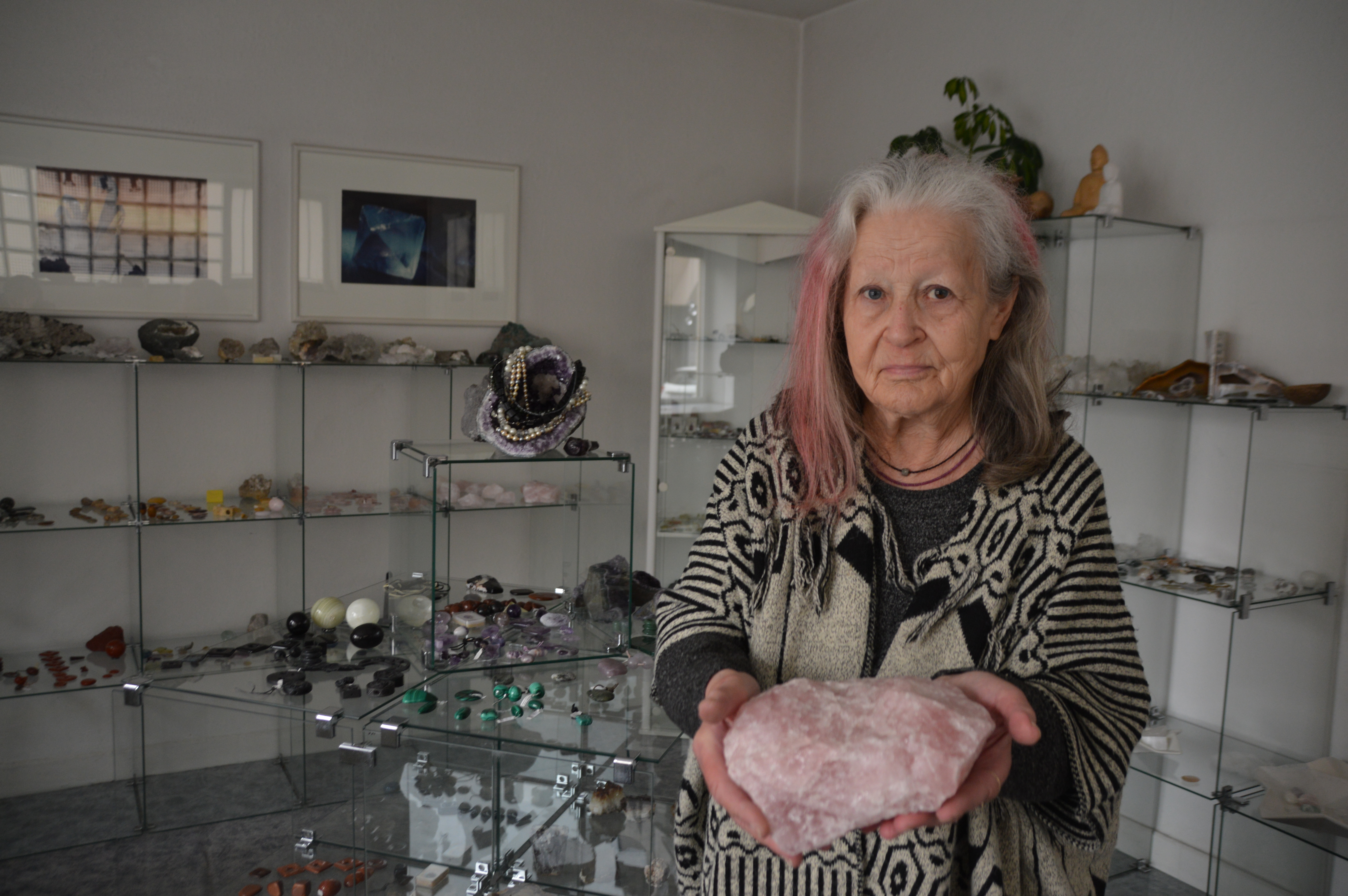 Johanna Schöllhuber mit einem Prachtexemplar von Rosenquarz. Bild: Wegner