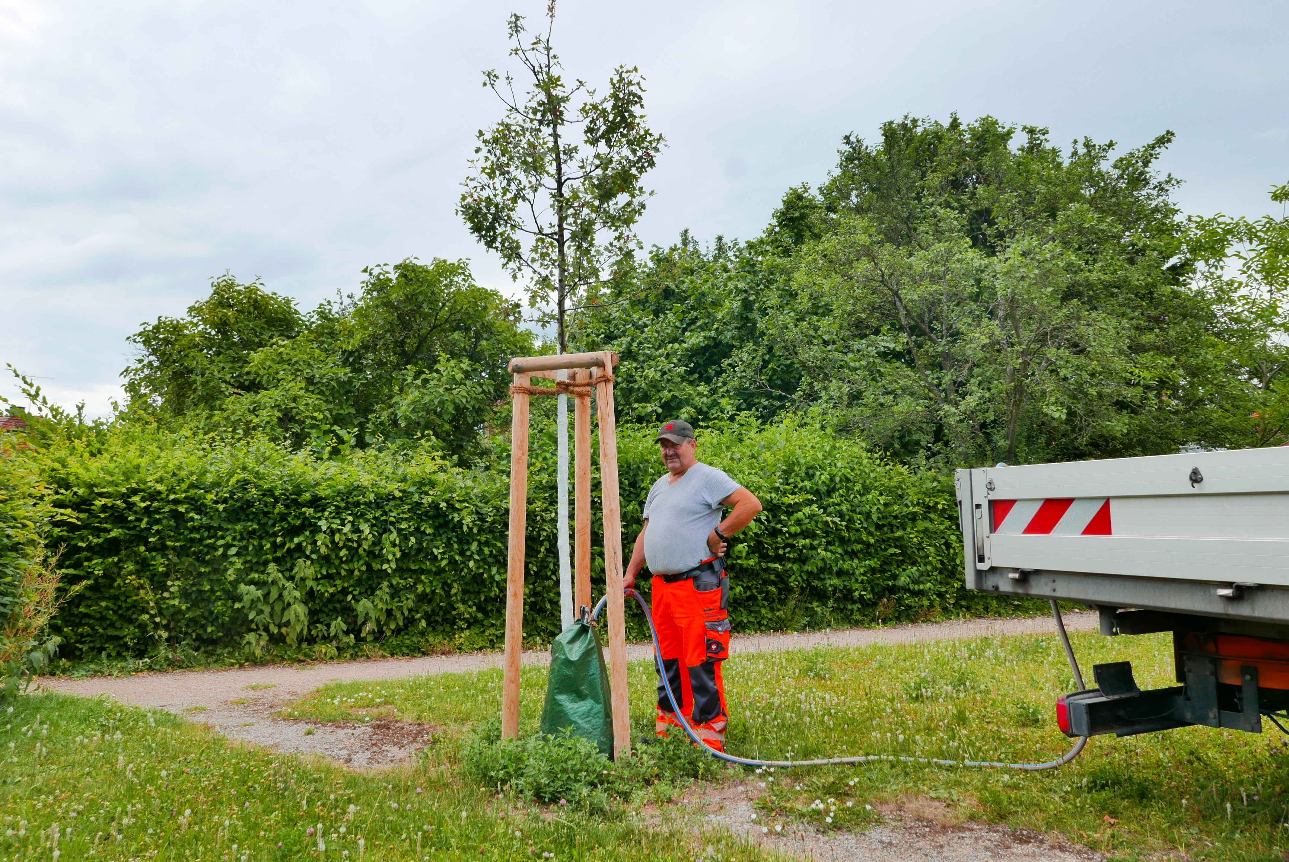 Böblingen. Die Wasserpumpe auf dem Pritschenwagen der Stadtgärtnerei rattert. Wasser Marsch. Auch Bäume haben Durst. Das Wasser ergießt sich aus dem Schlauch in den Bewässerungssack, der den Stamm des jungen Ahorn umfängt. „70 Liter gehen da hinein und sickern langsam in den Boden“, sagt Dieter Schmidt. Seit 6.30 Uhr ist er mit seinem orangefarbenen Transporter unterwegs, ein 2000 Liter Wasserfass Huckepack auf der Pritsche.