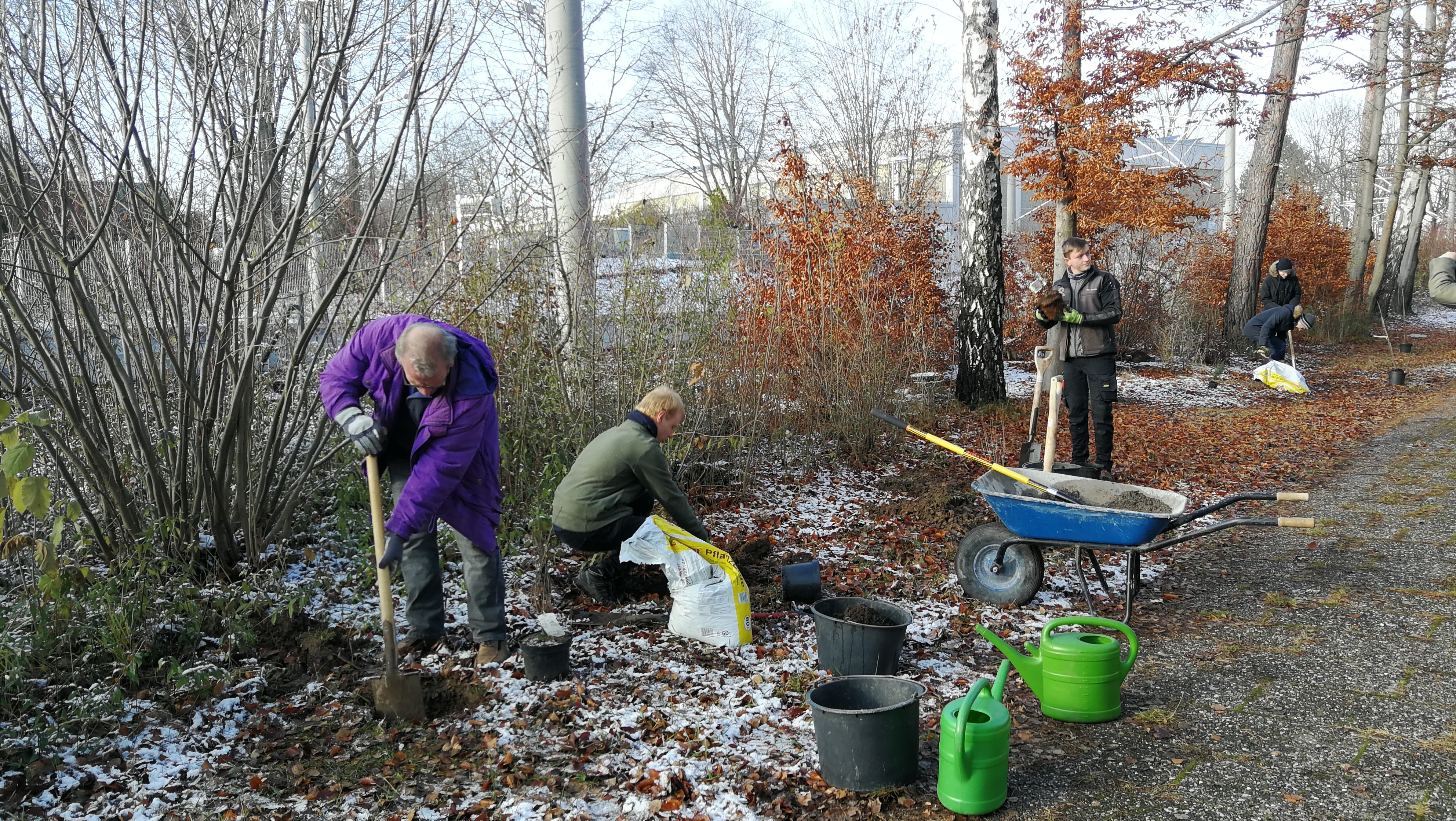 Trotz des Winterwetters arbeiteten ältere und jüngere Schüler, Laien und Profis samt drei Lehrern fleißig miteinander. Unterbrochen wurde nur kurz für eine Stärkung, mit Schokokeksen der Schulleitung. Um kurz vor 13 Uhr waren alle erstaunt, dass tatsächlich alle der fast 40 Pflanzen schon eingegraben waren.