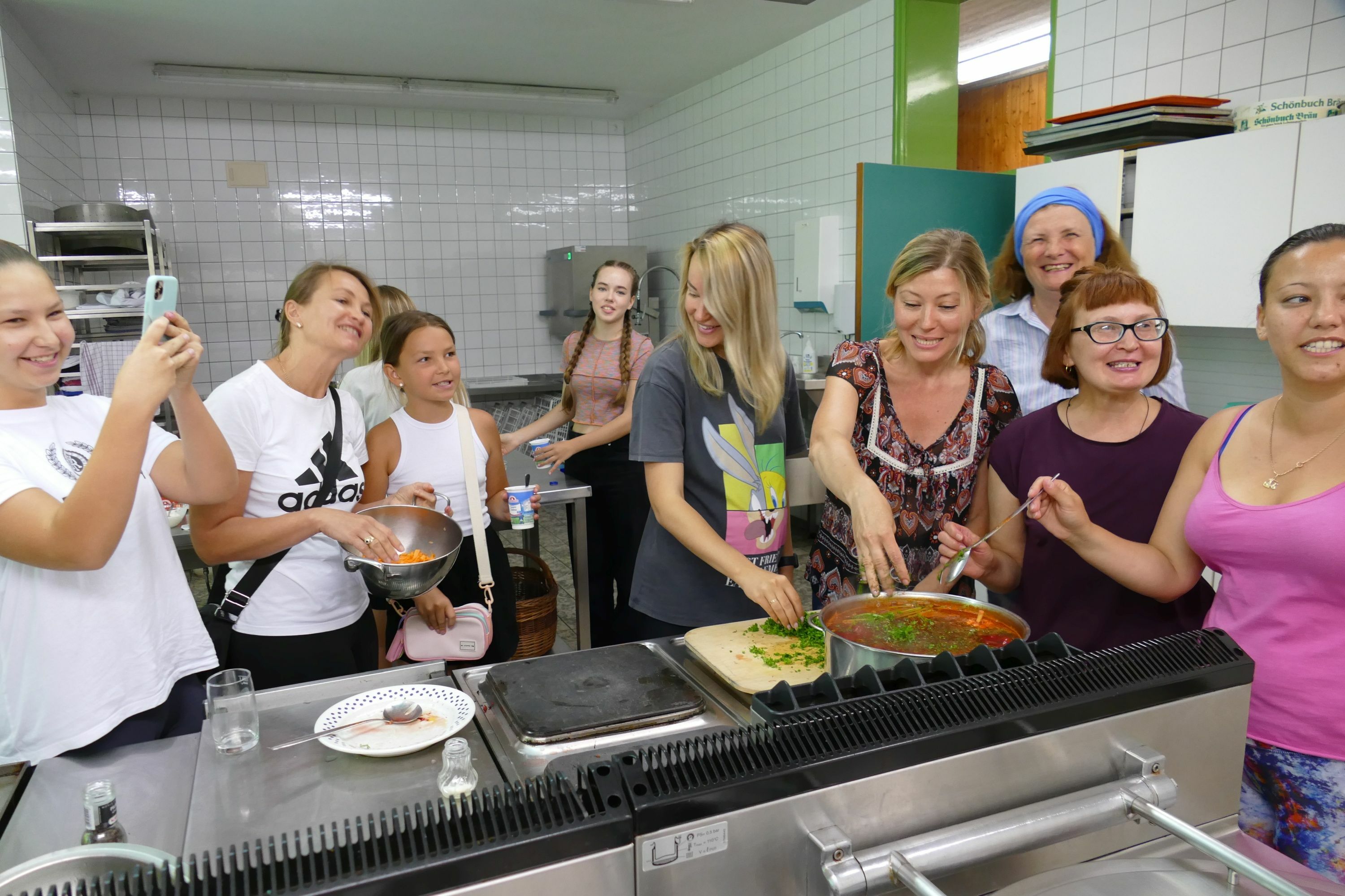 Беблінген. Наталя Діденко, яка вже працювала вчителькою німецької мови в Україні, а тепер і тут, різала овочі та м’ясо зі своїми слухачами з 8:30 ранку і трохи нервувала: «Ми ніколи не готували для такої кількості людей». Інша проблема полягає в тому, що кожен Борщ домочадці готують по-своєму і вони з різних регіонів країни, вирішили між собою. «Сварки не було, дійшли консенсусу» Компроміс: велика каструля борщу зі свининою і менша каструля без м’яса, але трохи інакше приправлена. А потім стоять біля печі і скандують: «Слава Україні, героям слава!» І ще: «Україно, шануй українських героїв!» Вони, може, радіють, що вже не бачать війни щодня, але їхні чоловіки є і батьки завжди в її думках.