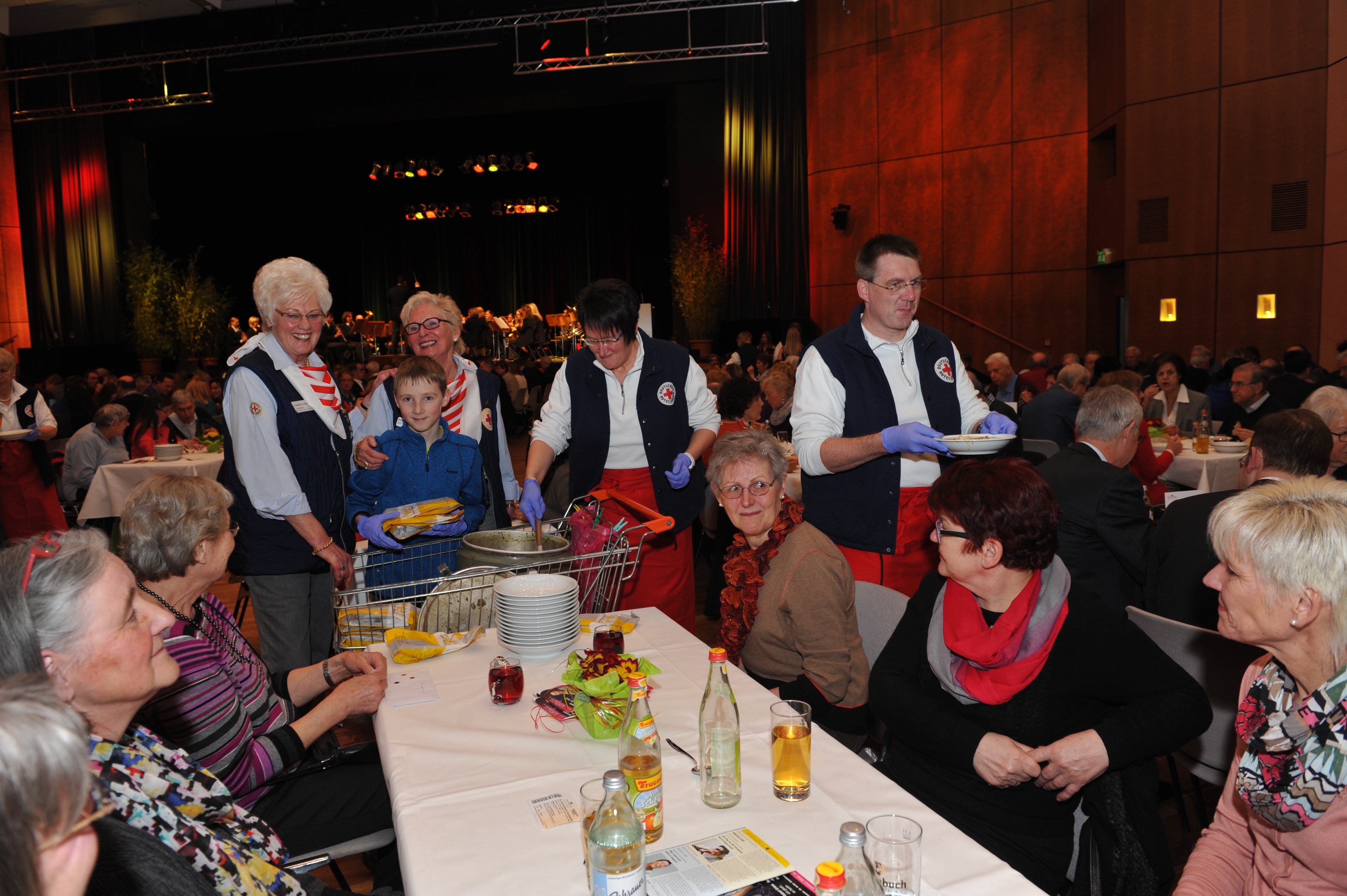 Über 50 Helfer des Deutschen Roten Kreuzes sorgten dafür, dass das Publikum nicht hungern musste. Seit 34 Jahren sind Gerda Schmidt und Karin Bopp (von links) bei der Aschermittwochsveranstaltung als Helferinnen dabei. Bild: Stampe