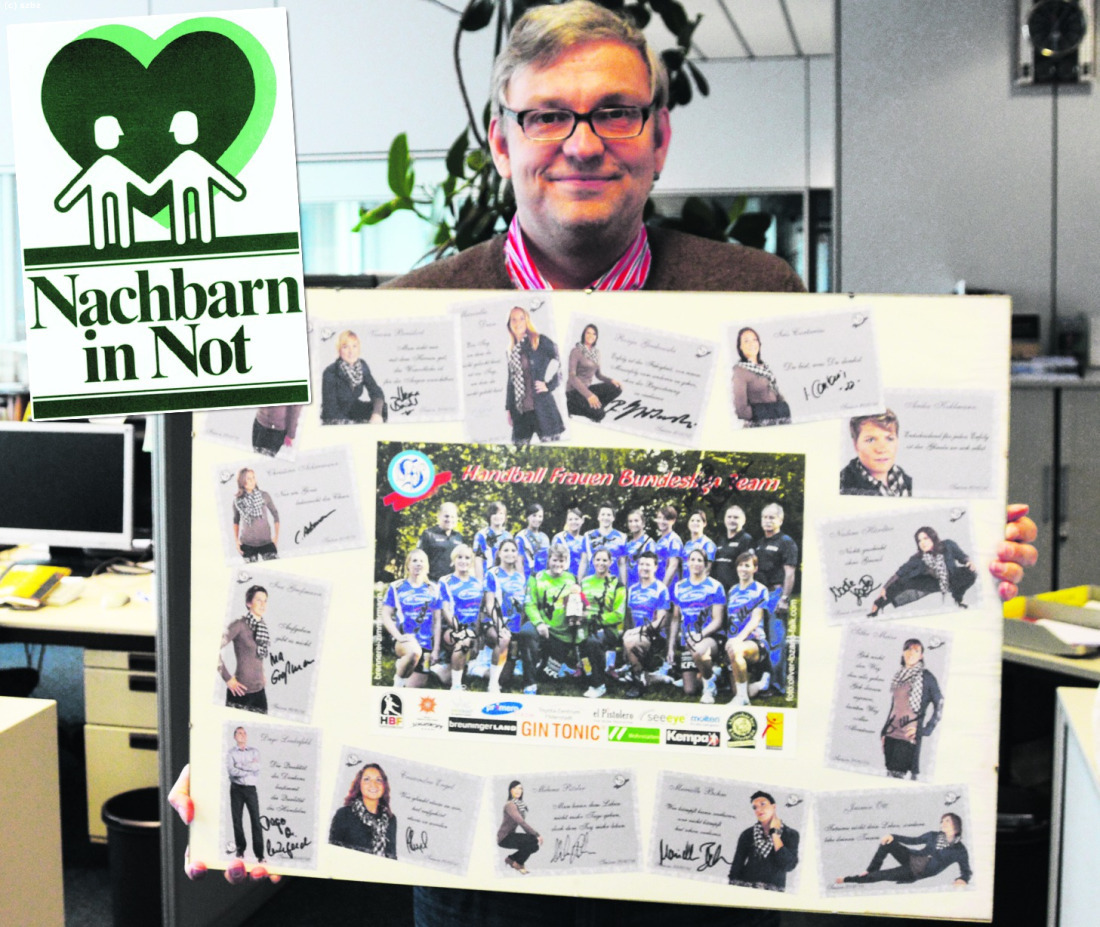 SZ/BZ-Sportredakteur Philipp Hamann hält ein passendes Weihnachtsgeschenk für Handball-Fans, Anhänger des VfL Sindelfingen und Autogrammjäger in der Hand: das gerahmte Mannschaftsbild der Sindelfinger Handballfrauen aus der Saison 2010/2011 mit den Original-Unterschriften der Spielerinnen. In dieser Spielzeit lockten Cassandra Engel, Christina Ackermann, Nadine Härdter, Ina Großmann, Iris Cartarius oder Marcella Deen unter Trainer Dago Leukefeld die Zuschauer zu den Bundesligaspielen in die Sommerhofenhalle. ...