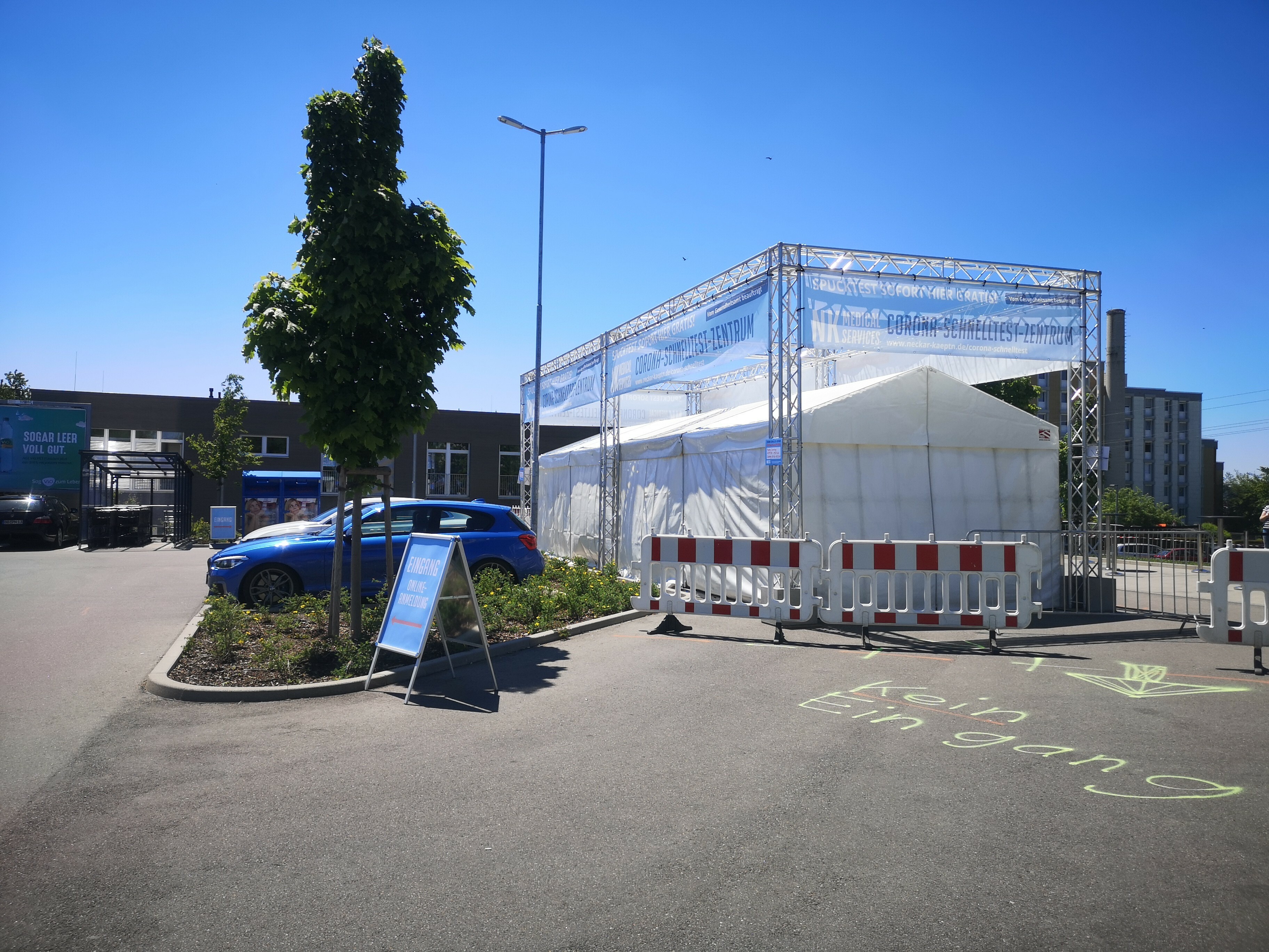 Nach der Kritik an der Wartesituation und dem Ablauf der Testungen in der Schnelltest-Stelle beim Edeka in Dagersheim hat der Betreiber reagiert und ein größeres Zelt und Absperrungen aufgestellt.  Bild: Groß