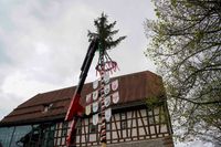 Dagersheim: Der Kran stellt den Maibaum auf den Dorfplatz