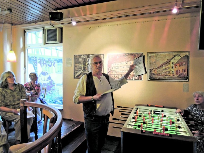 **Drei tote Maulwürfe zu Füßen des Handweber-Meisters Christian Gottlieb Reuff oder Weber Christian Proß, der am Klostersee-Eck an der heutigen Stiftstraße an seinem Häusle den Feierabend genießt: Das sind einige der Motive, die auf Collagen von Klaus Philippscheck zu sehen sind, die derzeit im Café in der Turmgasse ausgestellt werden. **