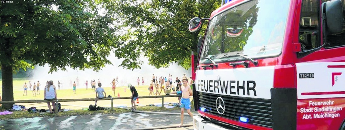 **Großeinsatz für die Sindelfinger Jugendfeuerwehr: 380 Kinder im Ferienwaldheim Eichholzer Täle konnten sich an einem der heißesten Tage der letzten Wochen über eine Abkühlung freuen. Die Jugendfeuerwehr kam mit zwei großen Löschfahrzeugen sowie Jugendleitern und aktiven Jugendlichen zu Besuch. **