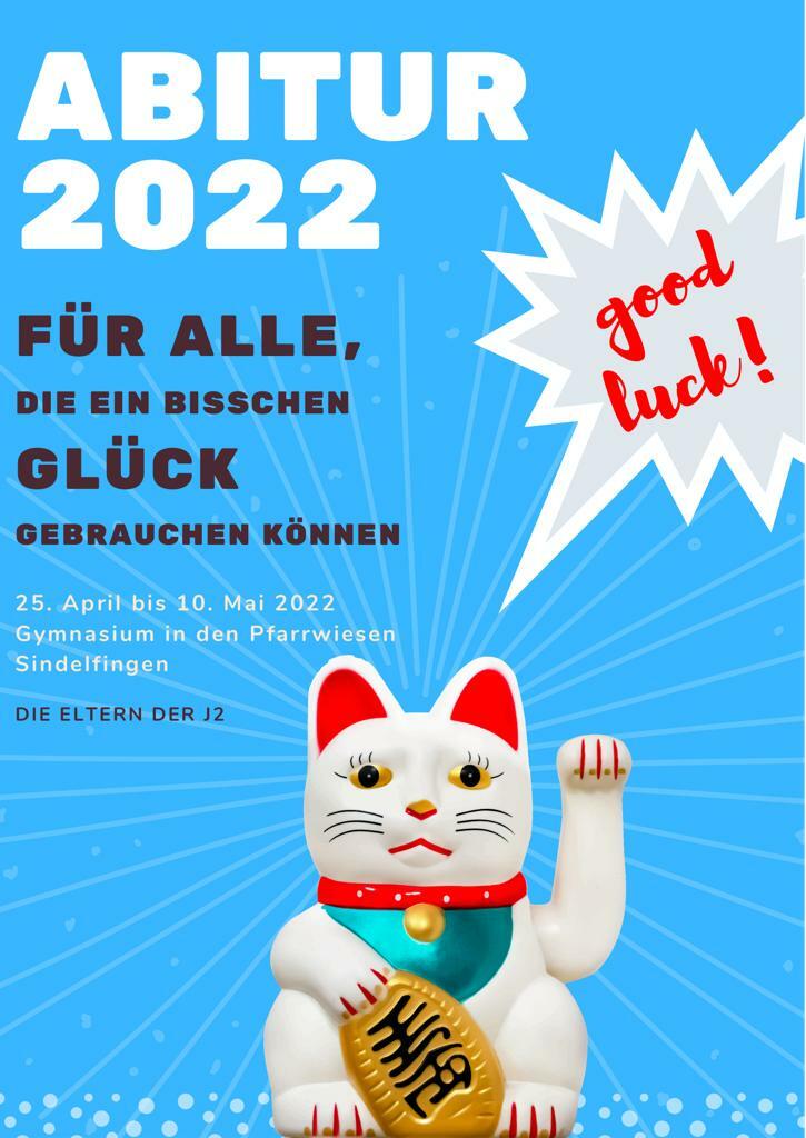 Kreis Böblingen. Das Abitur beginnt heute morgen um 9 Uhr mit den schriftlichen Prüfungen in italienisch, portugiesisch und spanisch. Der Elternbeirat des Sindelfinger Pfarrwiesen-Gymnasiums hat für die Schülerinnen und Schüler und deren Eltern ein Plakat zur Motivation geschaffen. Am Dienstag stehen die Fächer Bildende Kunst, Informatik und Sport auf dem Abi-Programm. Die SZ/BZ drückt allen Abiturienten und Abiturientinnen die Daumen. phi