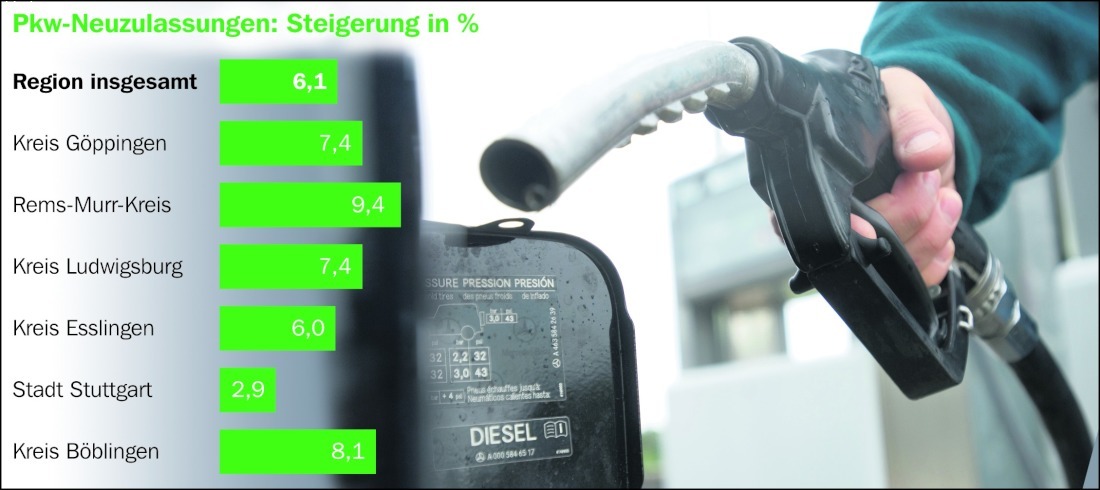 **Die Nachfrage nach Diesel-Autos bröckelt in der Region Stuttgart weiter: Im Kreis Böblingen blieb die Zahl der Neuzulassungen im November mit minus 0,5 Prozent fast stabil, gleichzeitig ging die Zahl ...