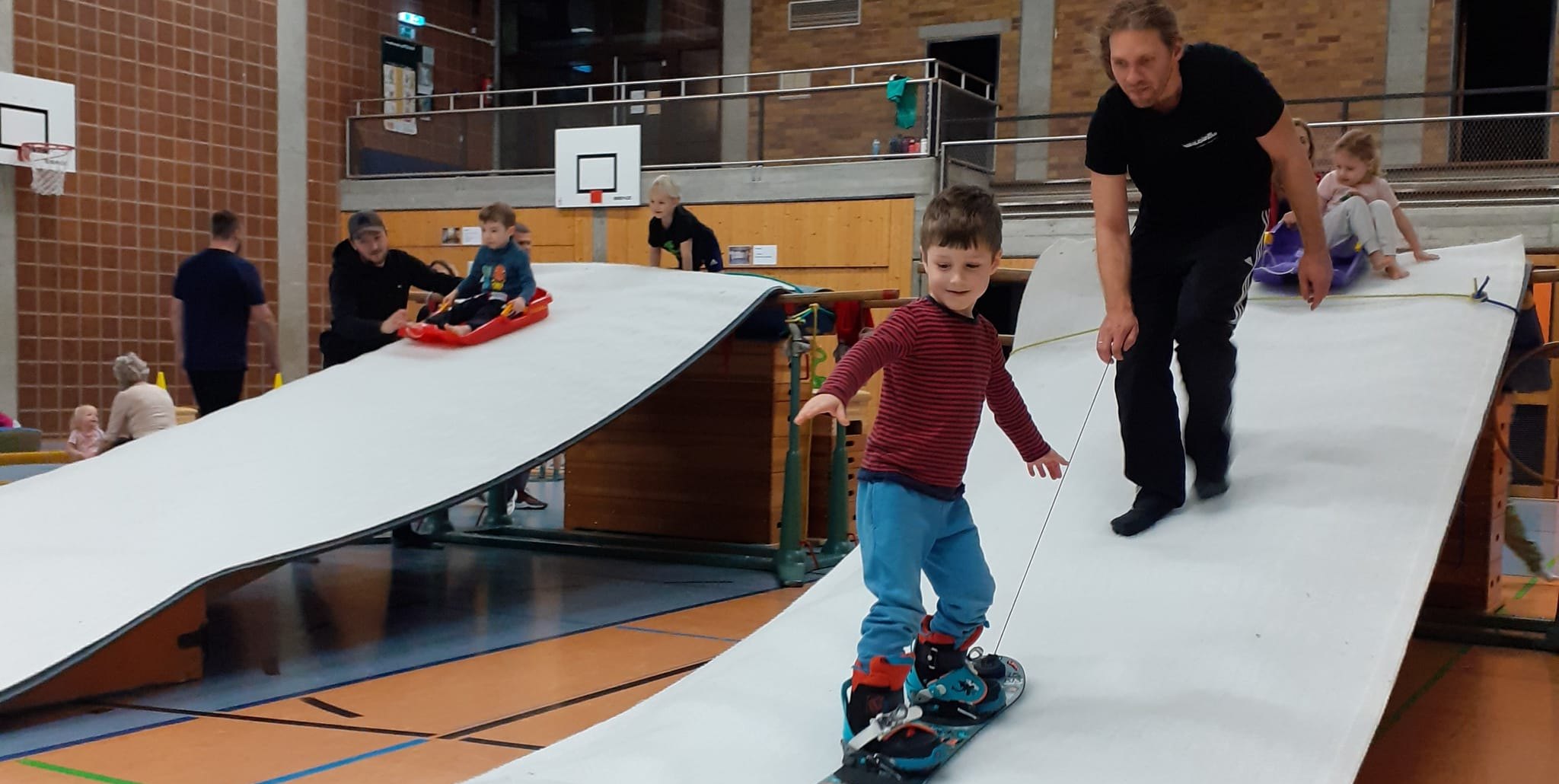 Turnen. Immer im Dezember gibt es beim Eltern-Kind-Turnen des GSV Maichingen besondere Turnstunden zum Thema Winter. Mit dabei auch immer eine Bobbahn, die allerdings nur aus dem Bodenläufer besteht und die Bobs aus Rollbrettern. In diesem Jahr gab es eine Besonderheit. Eine Kooperation mit der DSV Skischule Sindelfingen machte es möglich, dass es in diesem Jahr fast richtigen Schnee in der Sporthalle der Johannes-Widmann-Gemeinschaftsschule gab. Dank der weißen textilen Skimatten kam schon ein bisschen Winterstimmung auf. Die Kinder im Alter von drei und vier Jahren hatten hoffnungsvoll ihre Poporutscher mitgebracht, ein Kind sogar sein „Schnoboard“.