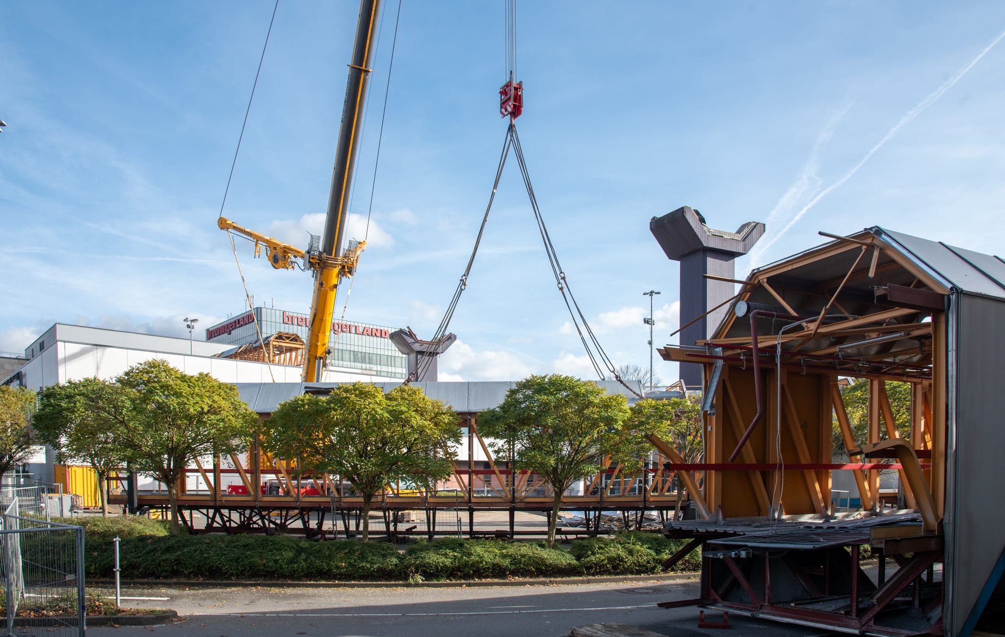 Sindelfingen. Die Brücke zwischen dem früheren Logistik-Bereich und dem Breuningerland Sindelfingen ist Geschichte. Im Lauf der Woche wurden die Brückenteile aus ihrer Betonverankerung gehoben und abtransportiert.