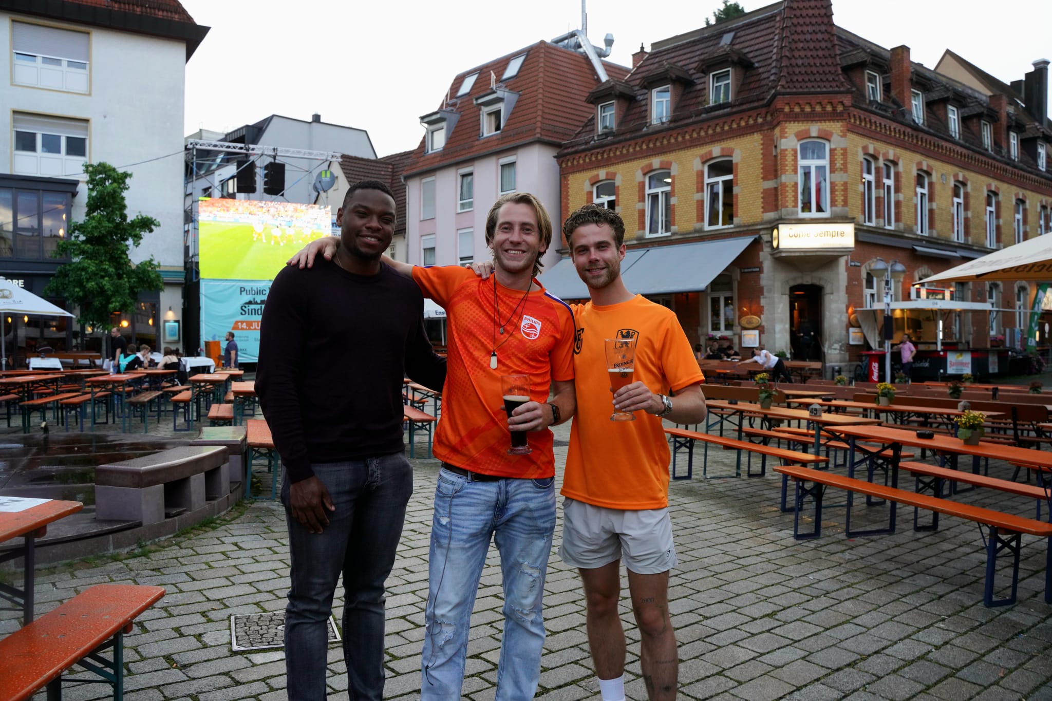 Apropos Wasser. Knapp drei Stunden vor Spielbeginn ziehen dunkle Wolken über Sindelfingen auf. Kurz vor Anpfiff beginnt es auf dem Wettbachplatz zu regnen. Es wird aber keiner nass. Die wenigen Fans passen alle unter die Schirme. Bis auf die drei Niederländer Victor van Derten, Kevin Emi und Matthys Klaassen. Die brauchen keinen Schirm. „Wir sind zum Arbeiten in Sindelfingen und schlafen hier in einem Hotel. Bei diesem Spiel müssen wir hier dabei sein“, sagt Victor van Derten, der auf einen 3:1-Sieg seiner Holländer tippt. Es geht auch gleich gut los für die Elftal. Xavi trifft aus 18 Metern zur 1:0-Führung.