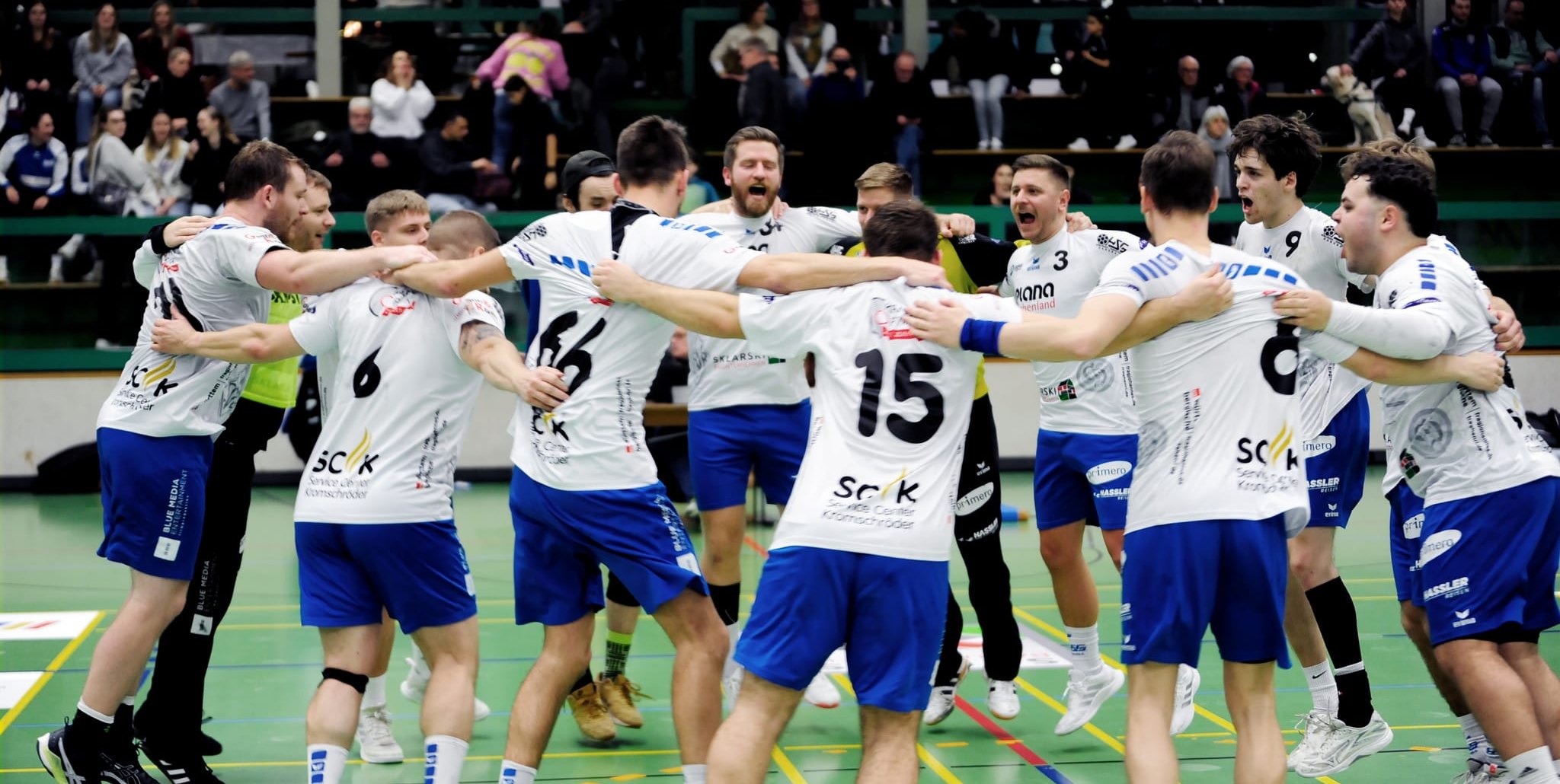 So feiern die Handballer der HSG Böblingen/Sindelfingen 2 den Derbysieg gegen Schlusslicht TSV Schönaich. Bild: photostampe