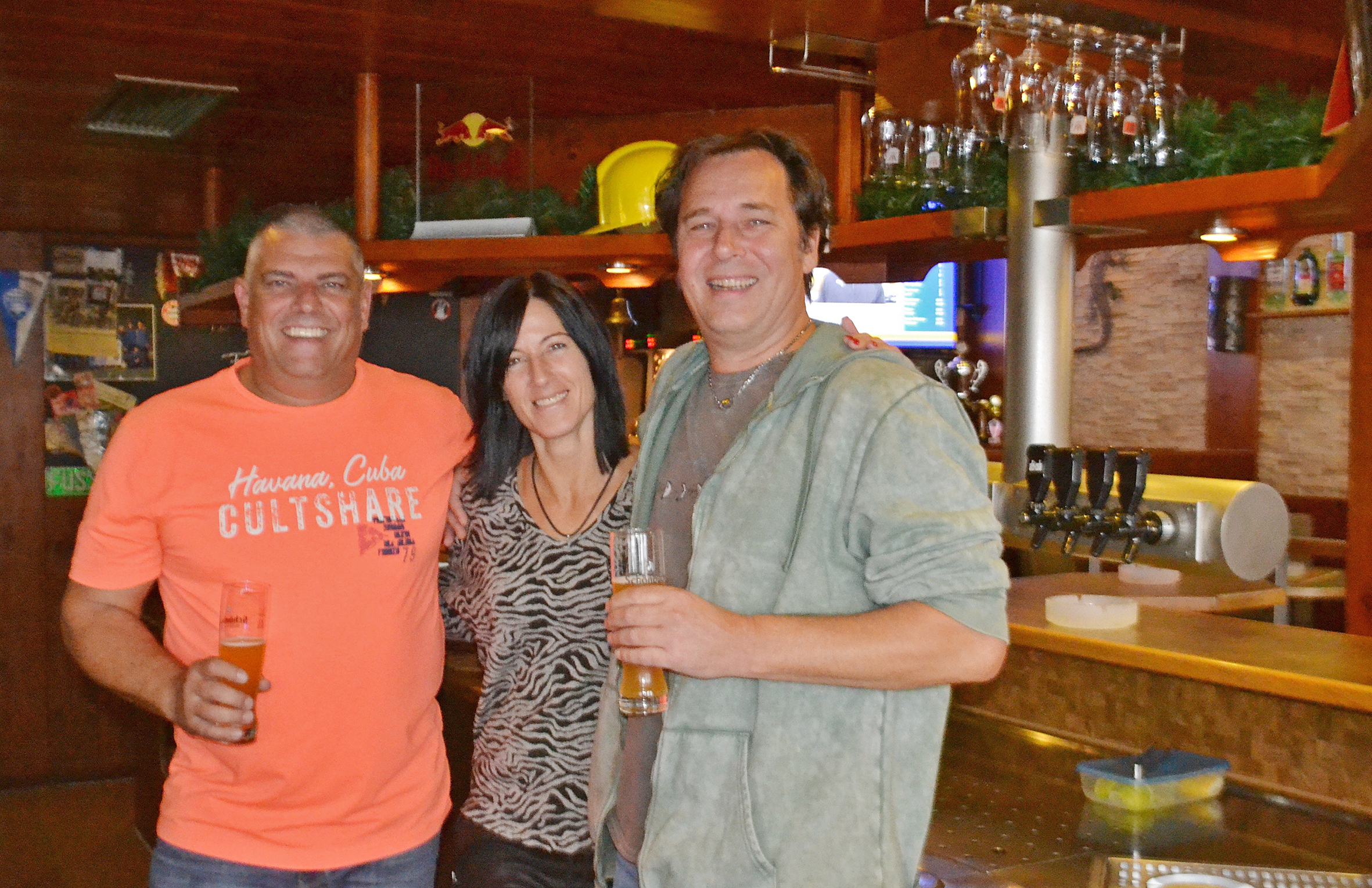 Wirt Michael Baier mit Frau Stefanie und Uwe Rebmann, der nebenbei hinterm Tresen aushilft, hinter der Bar im Trotzköpfle. Das "TK" hat inzwischen Kultstatus erlangt - nicht nur in Schönaich. Bild: Hamann