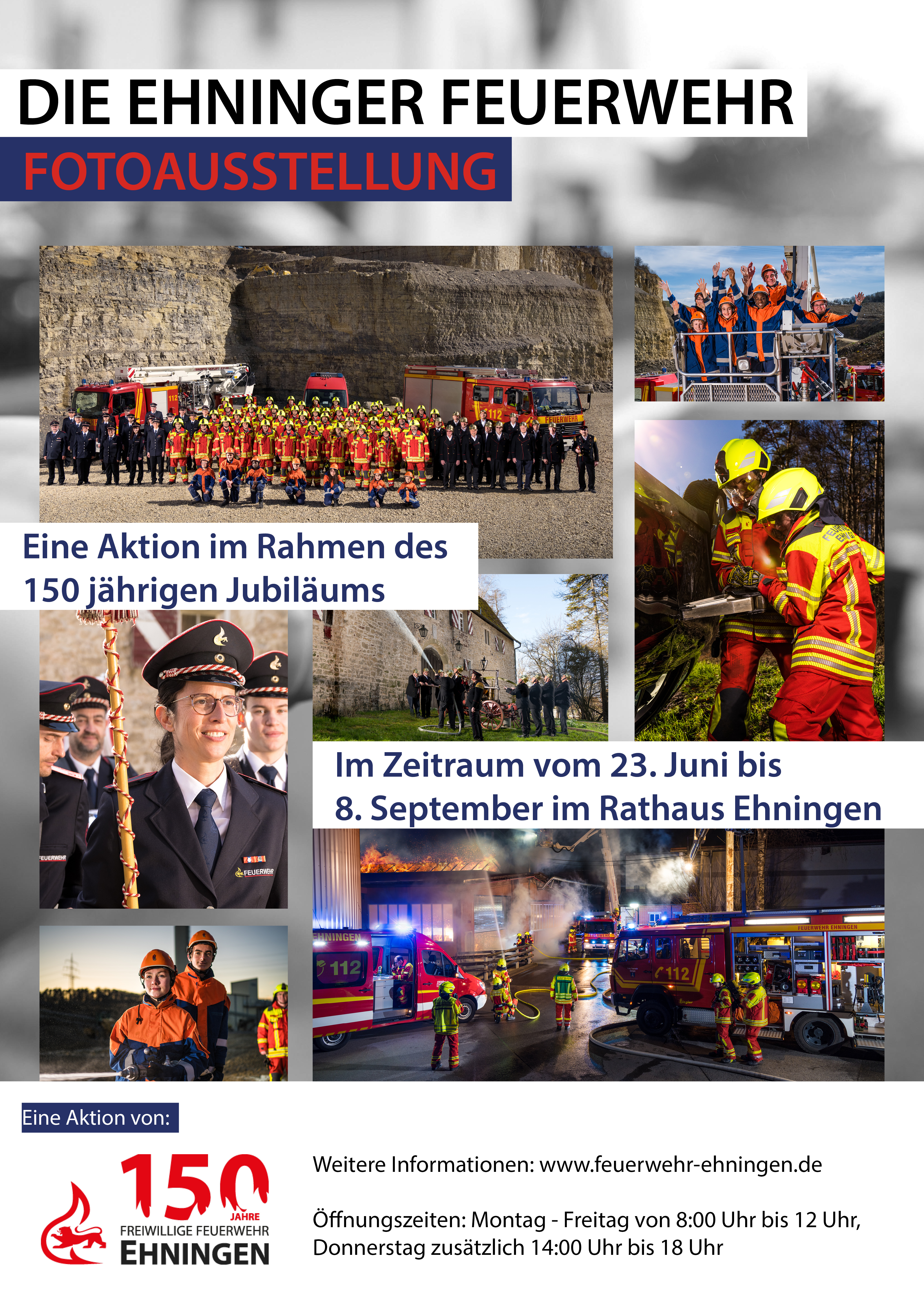 Die Ausstellung zeigt die vielfältige Arbeit, die durch die ehrenamtlichen Einsatzkräfte geleistet wird. Mit Hilfe von professioneller Fotografie und moderner Bildbearbeitung, sind beeindruckende Bilder der Abteilungen (Jugendfeuerwehr, Einsatzabteilung, Altersabteilung und Spielmannszug) entstanden. Zusätzlich wird die Fahrzeughistorie der Ehninger Wehr sowie die Entwicklung der Funkmeldeempfänger zur Alarmierung der Einsatzkräfte ausgestellt.