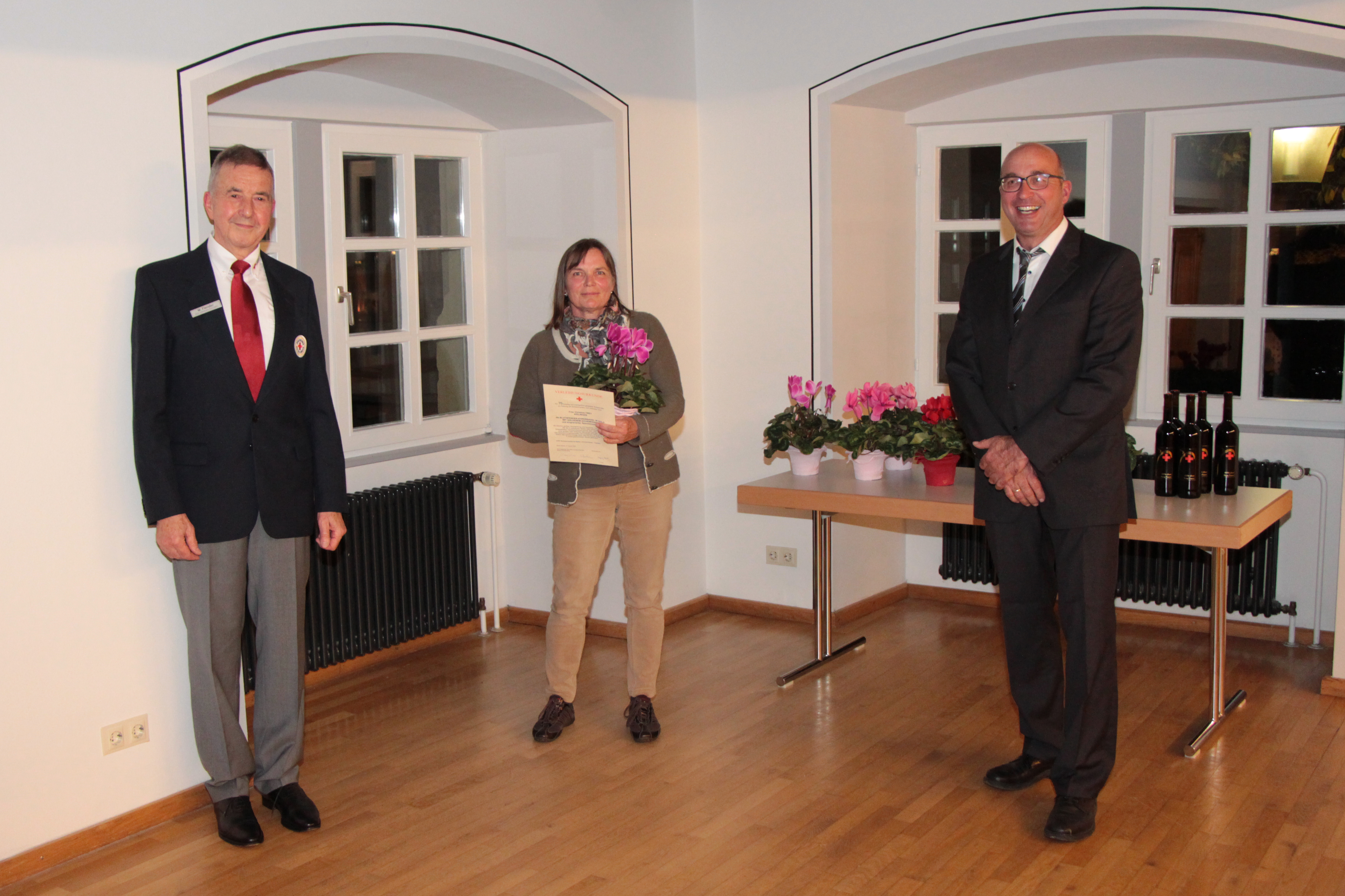 Blutspender-Ehrung im Rittersaal: Wolfgang Flender (Vorsitzender des DRK Ortverbandes Aidlingen), Christine Frey (75 Spenden), Thomas Rott (stellvertretender  Bürgermeister der Gemeinde Aidlingen/ von links).