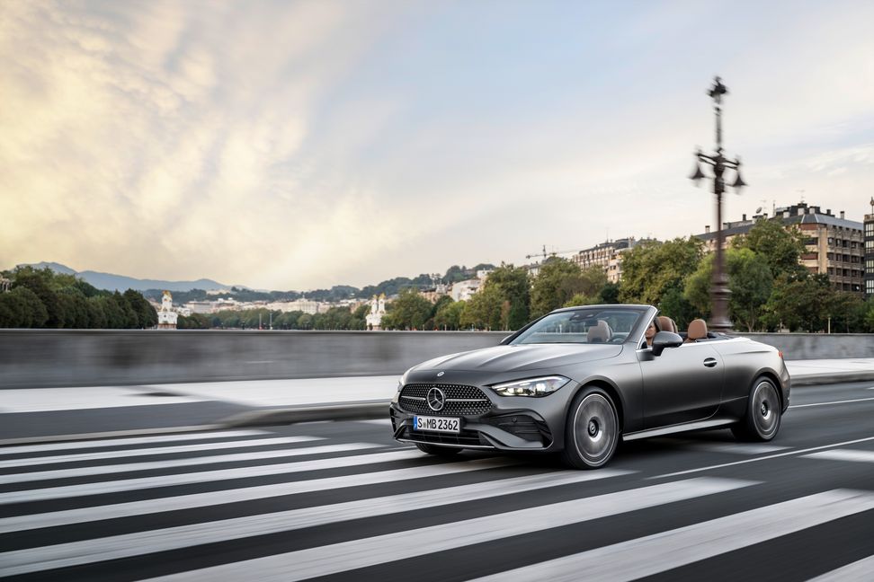 Das Fahrwerk des neuen CLE Cabriolets ermöglicht Fahrspaß auf kurvigen Straßen. Gleichzeitig bietet es außergewöhnlichen Fahrkomfort auf langen Strecken. Standardausstattung ist das um 15 Millimeter tiefergelegte Komfortfahrwerk. Es vereint souveränen Fahrkomfort und sportliche Direktheit. Auf Wunsch steht ein Sportfahrwerk mit amplitudenselektivem Dämpfungssystem zur Verfügung. Für ein besonders sportliches oder alternativ komfortables Fahrvergnügen sorgt das optionale Dynamic Body Control Fahrwerk. Es bietet eine kontinuierliche, adaptive Verstelldämpfung an Vorder- und Hinterachse. Das aktive Fahrwerk steuert die Dämpfungscharakteristik im Zusammenspiel mit Motor-, Getriebe- und Lenkungseigenschaften für jedes Rad einzeln – passend zu Fahrsituation, Geschwindigkeit und Fahrbahnzustand. Über den Dynamic Select Schalter hat die Fahrerin oder der Fahrer die Wahl zwischen komfortabler oder sportlich straffer Abstimmung.