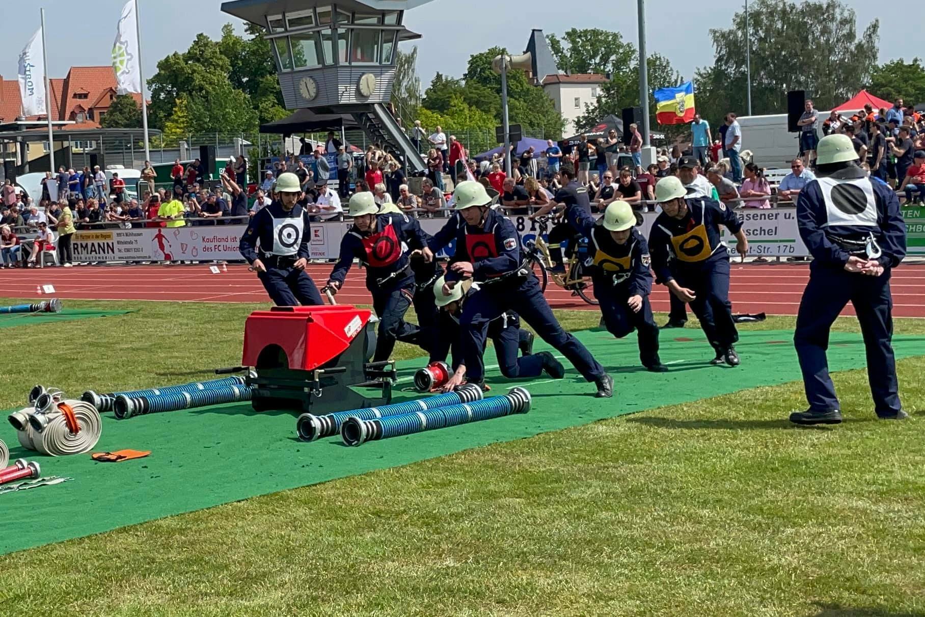 Zu absolvieren ist bei den CTIF-Wettkämpfen ein so genannter „trockener“ Löschangriff, also ohne Wasser, bei dem auf Zeit zunächst Saugschläuche gekuppelt werden müssen und danach zwei Rohre zum fiktiven Brandobjekt hin ausgebracht werden müssen.