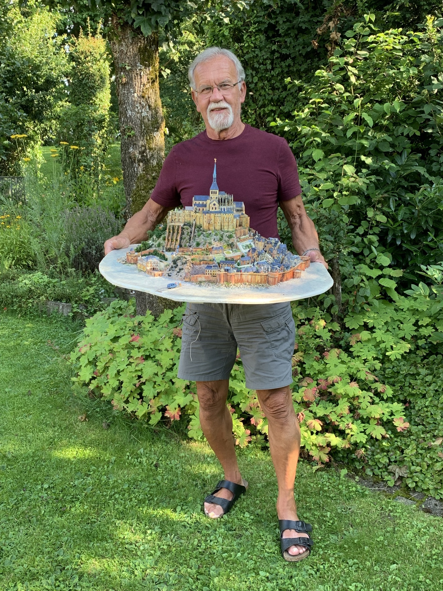 Hier zeigt Helmut Schmidt sein Kartonmodell  der bretonischen Abtei Mont St. Michel.      Bild: Holzapfel