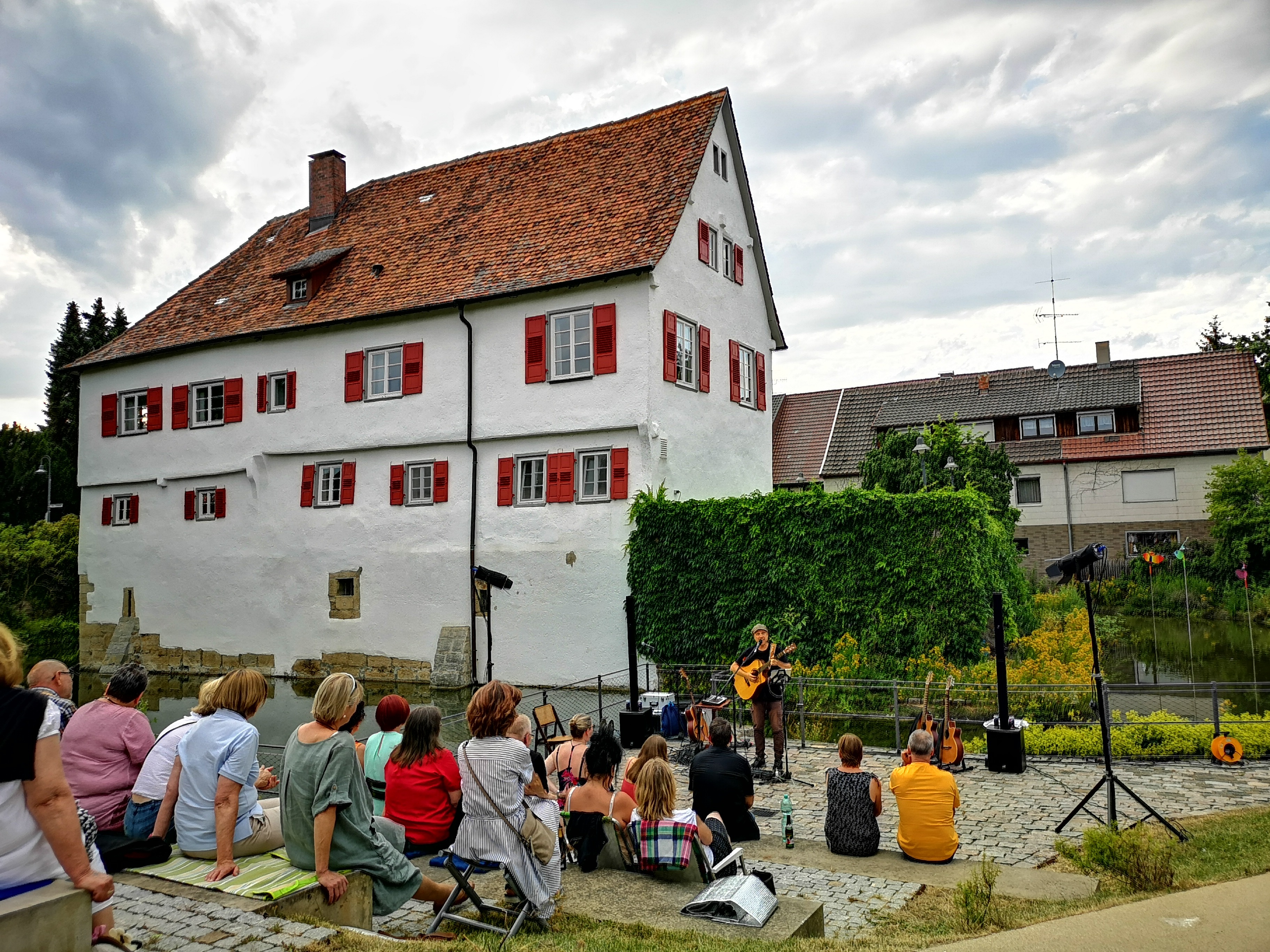 Es ist aufgestuhlt im Burggarten. Die Schwäne im Burggraben drehen entspannt ihre Runden. Nach einem heißen Sommertag lächelt die Sonne immer noch T-Shirt-warm über der Burg Kalteneck. „Kinder, haben wir es schön heute. Solche Abende gibt es nur ganz selten in Deutschland“, sagt Gitarrist Jürgen Ammann zur Begrüßung.