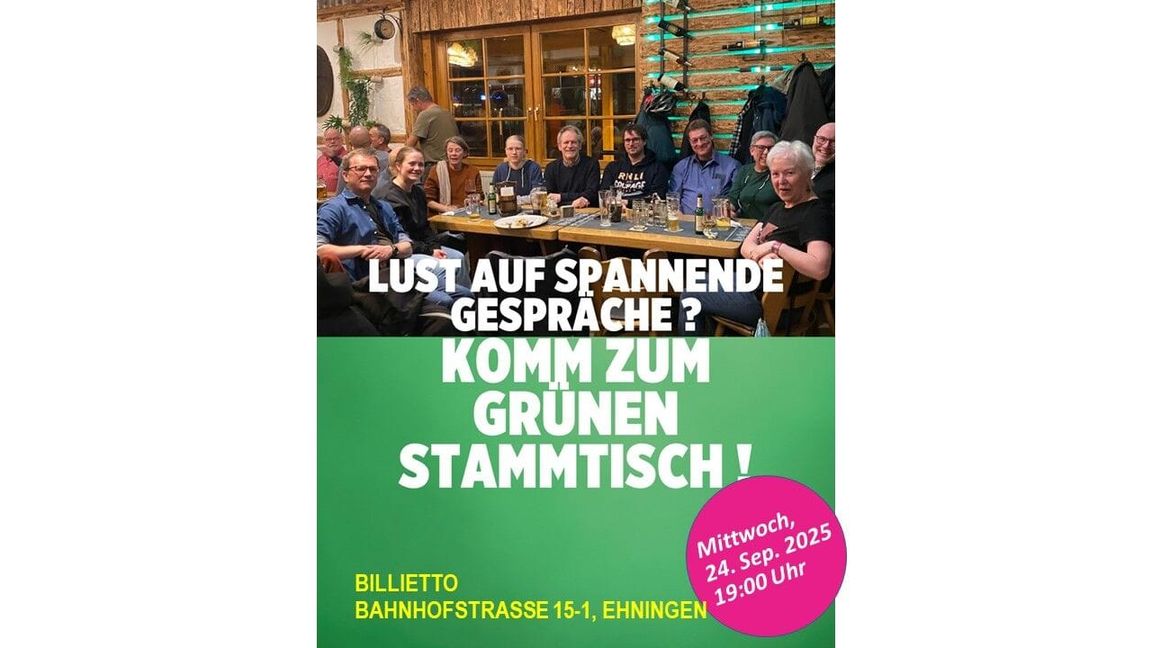 Den nächsten Grünen-Stammtisch gibt es am Mittwoch, den 24. September 2025.