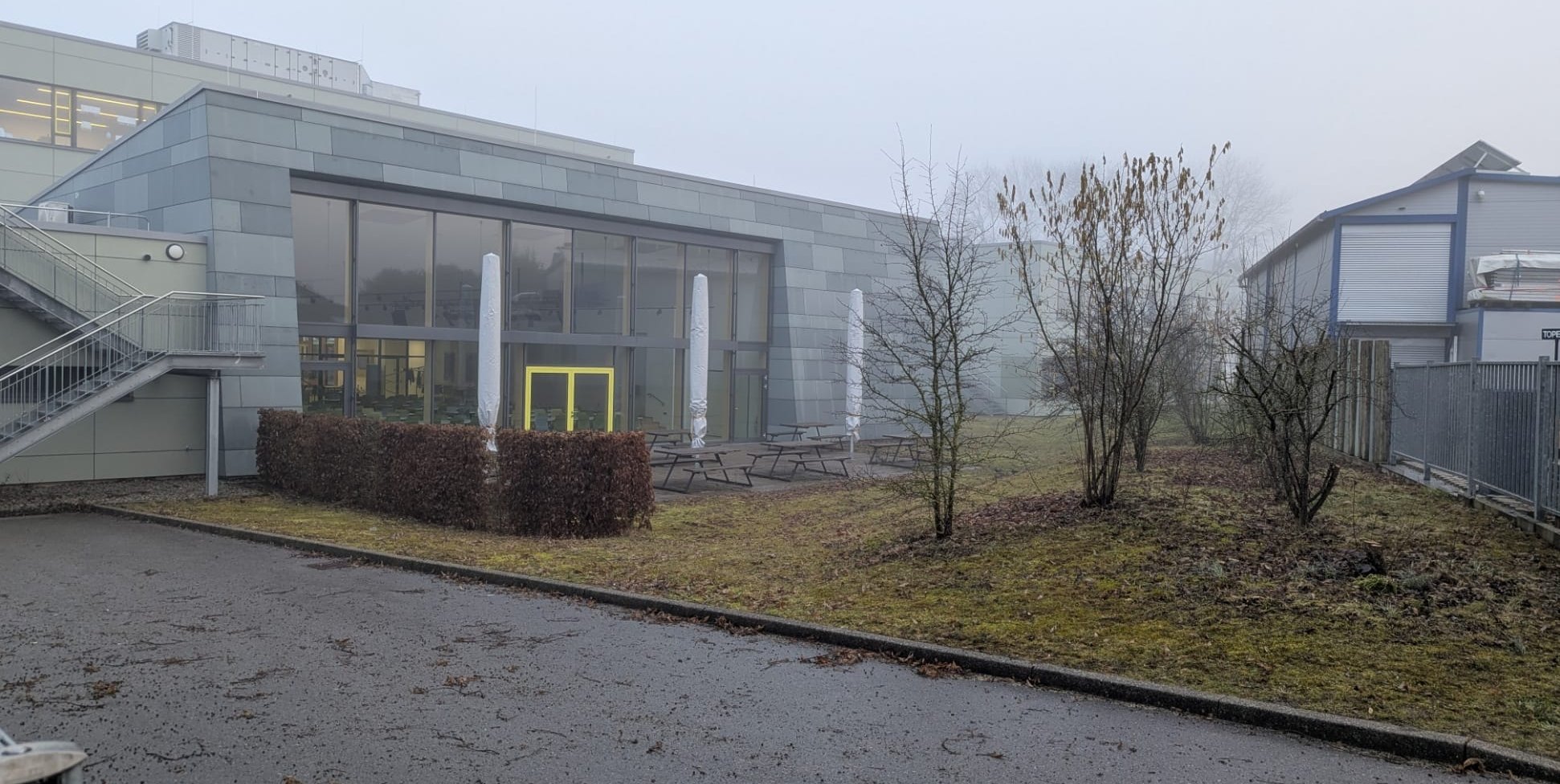 Auf Terrasse und Grünfläche soll die Mensa künftig 148 zusätzlichen Schülern Platz bieten. Bild: Nüßle