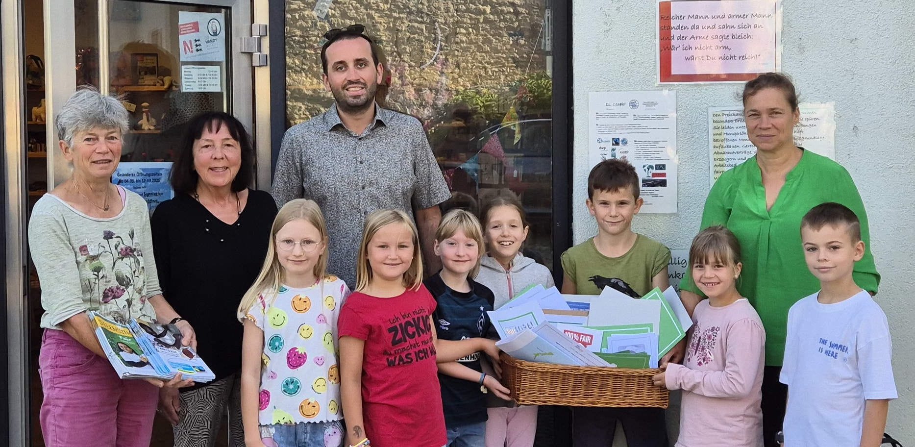 Wo wächst die Schokolade und wie die Banane? Was heißt eigentlich Kinderarbeit? Und bedeutet das Recht auf Bildung nicht auch eine Pflicht zu lernen? Was sind faire Löhne? Sind nur einige Themen, die sie behandeln könnten. Wir haben beim Weltladen-Dachverband und bei der Sternsingeraktion Bildungsmaterial bestellt und es den Kindern und der Rektorin vor den Ferien übergeben. Ortsvorsteher Henry Queck hat sich die Zeit genommen und ist zur Übergabe gekommen und hat betont, wie wichtig es ist, dass Kinder lernen, wo und unter welchen Bedingungen die Produkte, die sie kaufen, gemacht werden. Das Weltladenteam freut sich sehr, dass das Kollegium den Fairen Handel in den Lehrplan aufgenommen hat. Gerne können die Kinder auch mal den Laden besuchen. Aber bitte nicht alle auf einmal, dann platzt er aus allen Nähten. Den Weg zurück zur Schule versüßte Herr Queck den Kindern durch einen fairen Schokoriegel, das fanden nicht nur die Kinder klasse.