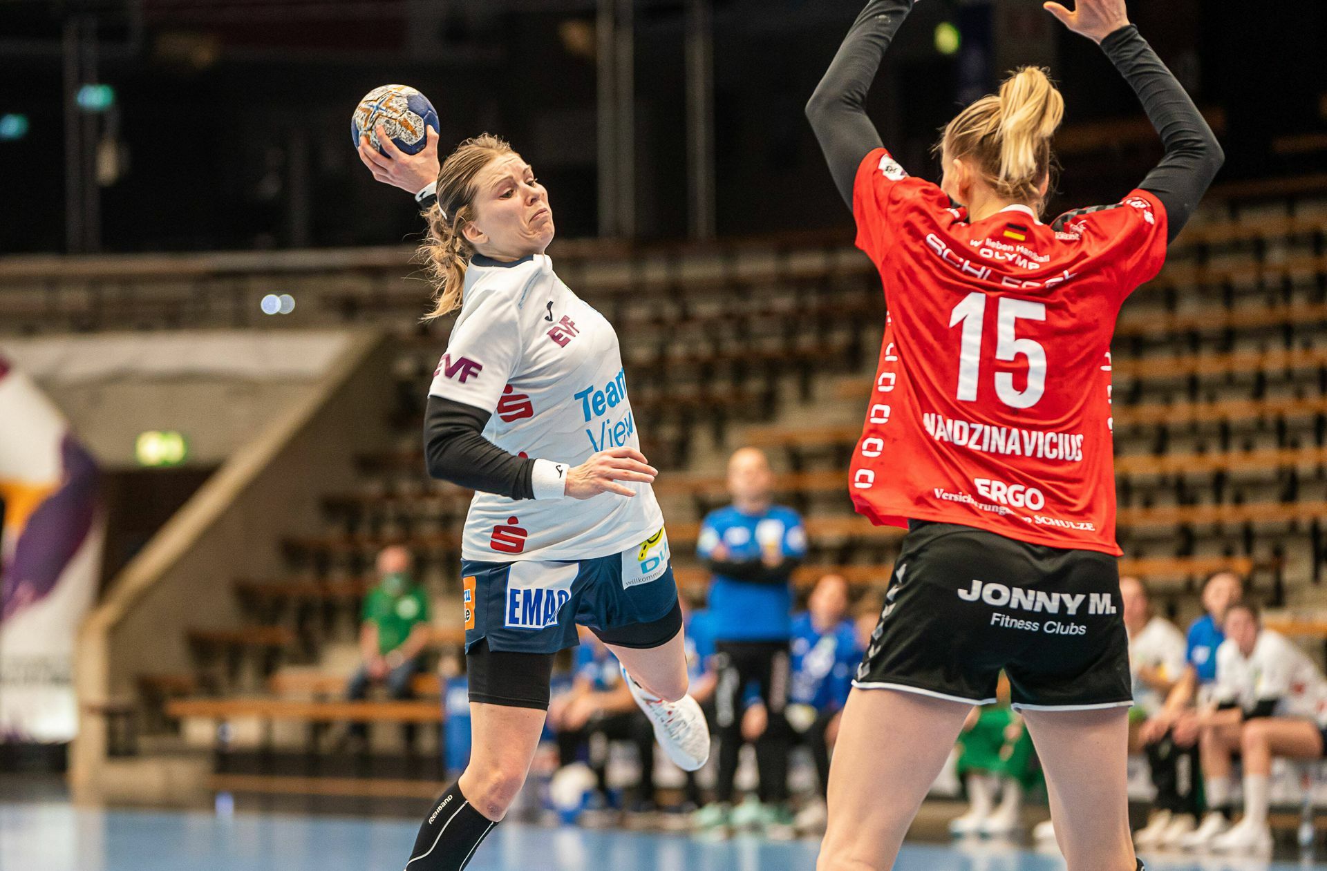 Frisch-Auf-Torjägerin Michaela Hrbkova (li.) versucht beim 22:27 im Hinspiel in der EWS-Arena  an Bietigheims Kim Naidzinavicius vorbeizuwerfen – am Samstag im Rückspiel steht für Göppingen viel auf dem Spiel. Foto: imago//Eibner