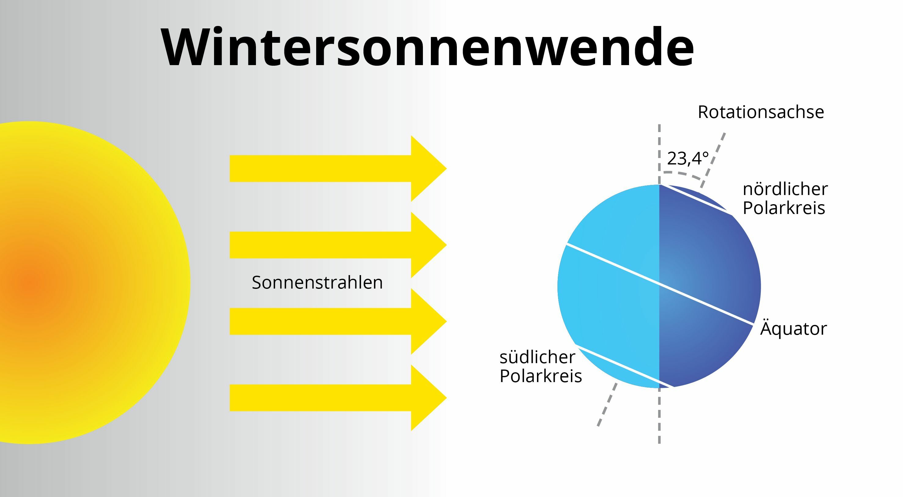 Wintersonnenwende um 22.47 Uhr. Die Sonnenwenden markieren den Beginn des astronomischen Sommers bzw. des astronomischen Winters. Wenn die Sonne ihre größte nördliche oder südliche Deklination von 23,4° erreicht, steht sie senkrecht über den sogenannten Wendekreisen der Erde (den Breitenkreisen auf 23,4° nördlicher bzw. südlicher Breite).