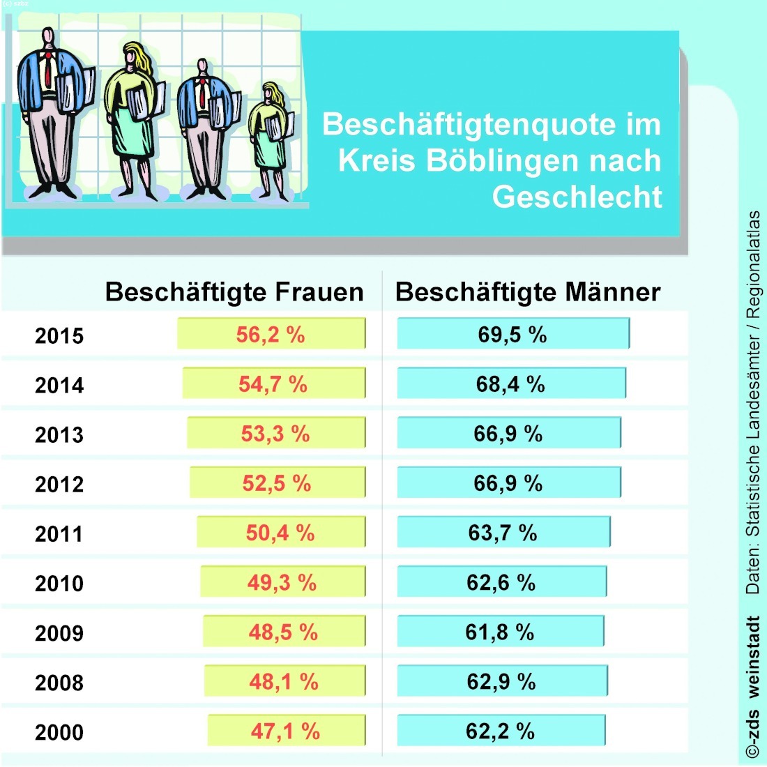 Im Jahr 2000 lag der Anteil noch bei 47,1 Prozent. Damit landet der Landkreis Böblingen deutschlandweit in puncto Frauenquote aktuell auf Platz 142 unter 402 ausgewerteten Städten, Kreisen und Stadtstaaten. Die Zahlen des Regional-Atlas beschränken sich auf sozialversicherungspflichtig Beschäftigte.