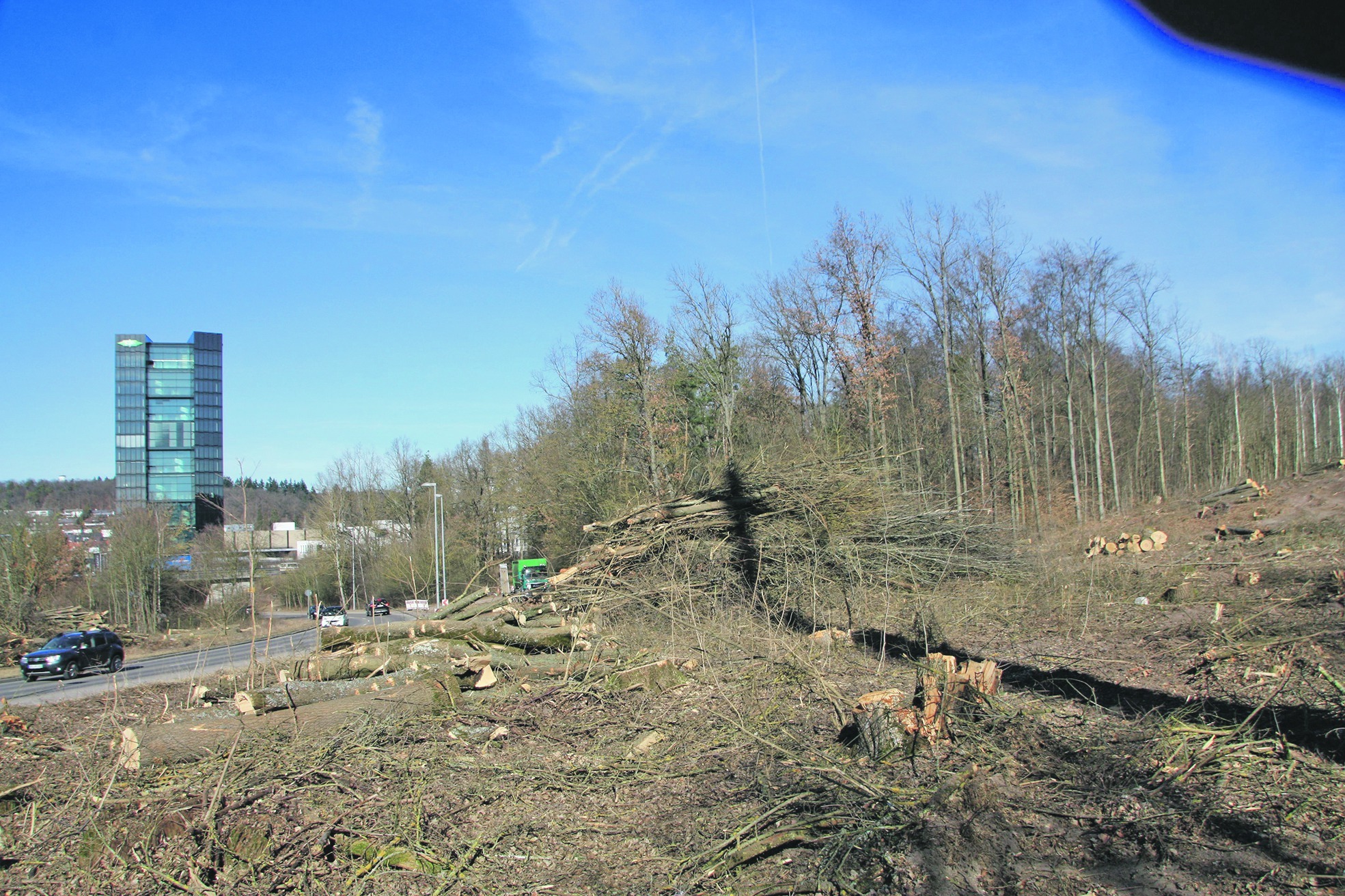 Dort, wo heute die Leibnizstraße zur Unterführung in Richtung Breuningerland schwenkt, führt künftig die Kreisstraße auch geradeaus weiter zum neuen Autobahnanschluss. Der künftigen Straßentrasse stehen aber rund 4 Hektar Wald im Wege. Zum Teil haben die Waldarbeiter mit schwerem Gerät schon ganze Arbeit geleistet, wie unschwer an der breiten Trasse entlang der Bahnlinie und den großen Poltern von Stammholz an der Leibnizstraße zu sehen ist. Laut Plan soll mit den Straßenbauarbeiten für das 13,3 ...