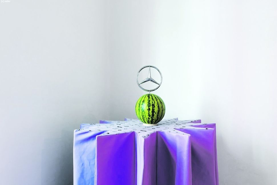 Der Mercedes-Stern auf der Melone kommt aus der Serie „A Fake Crocodile Can Make You Real Tears“ von Ana Navas, die derzeit in der Galerie der Stadt Sindelfingen ausstellt. Am Donnerstag, 26. Oktober, präsentieren um 18.30 Uhr im Kunstmuseum am Marktplatz Ana Navas, der Kommunikationsdesigner Santiago da Silva und Galeriechefin Madeleine Frey als Beitrag zu den baden-württembergischen Literaturtagen den Katalog zur Ausstellung, – peb –/Bild: Corinna von der Goeben/z