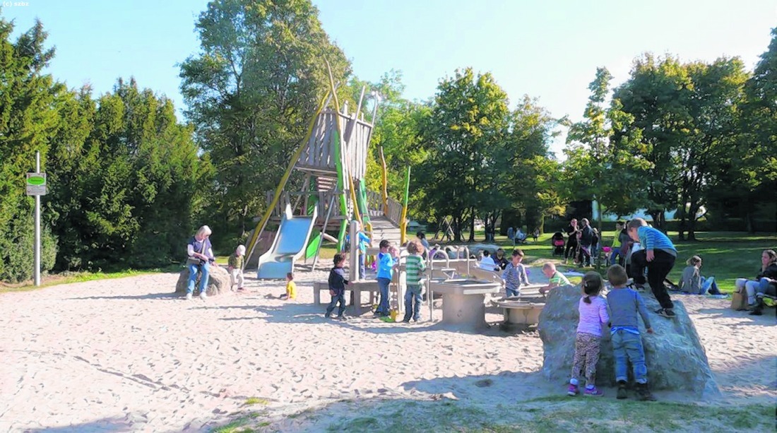 Den Kern des Platzes, der zur Landesgartenschau 1996 gebaut wurde, bilden zwei große Klettergerüste. Er eignet sich für alle Altersgruppen.