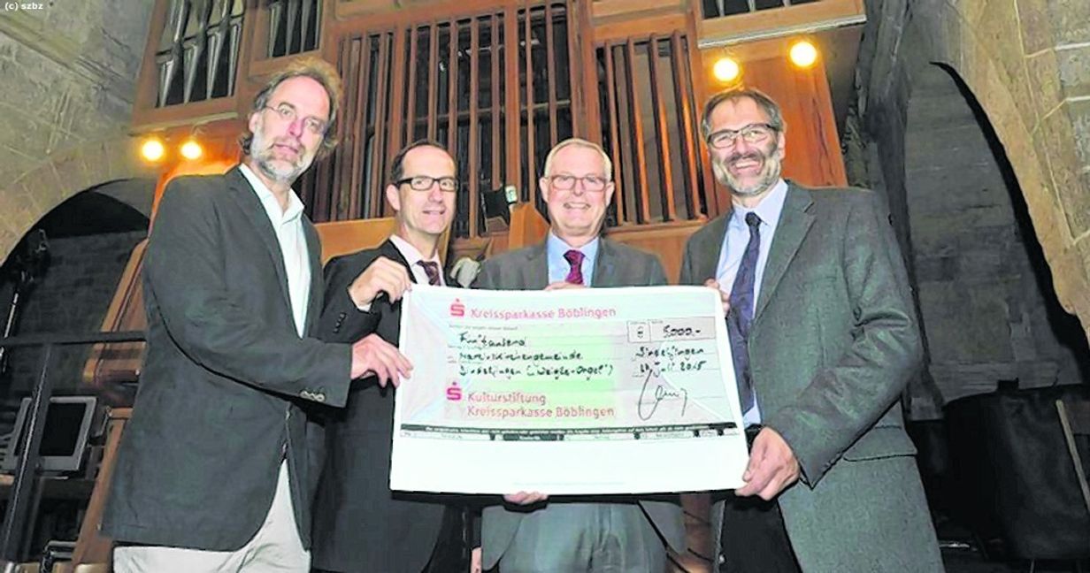Der Auftrag ist vergeben und mit der Spende in Höhe von 5000 Euro der Kreissparkasse (KSK) Böblingen sind seit gestern 134 000 Euro für die rund 150 000 Euro teure Modernisierung der Weigle-Orgel in der Martinskirche Sindelfingen auf dem Konto. Unser Bild zeigt von links Pfarrer Dr. Martin Frank, KSK-Filialleiter Frank Fausel, KSK-Chef Carsten Claus und Kirchenmusikdirektor Matthias Hanke. – peb –/Bild: Stampe