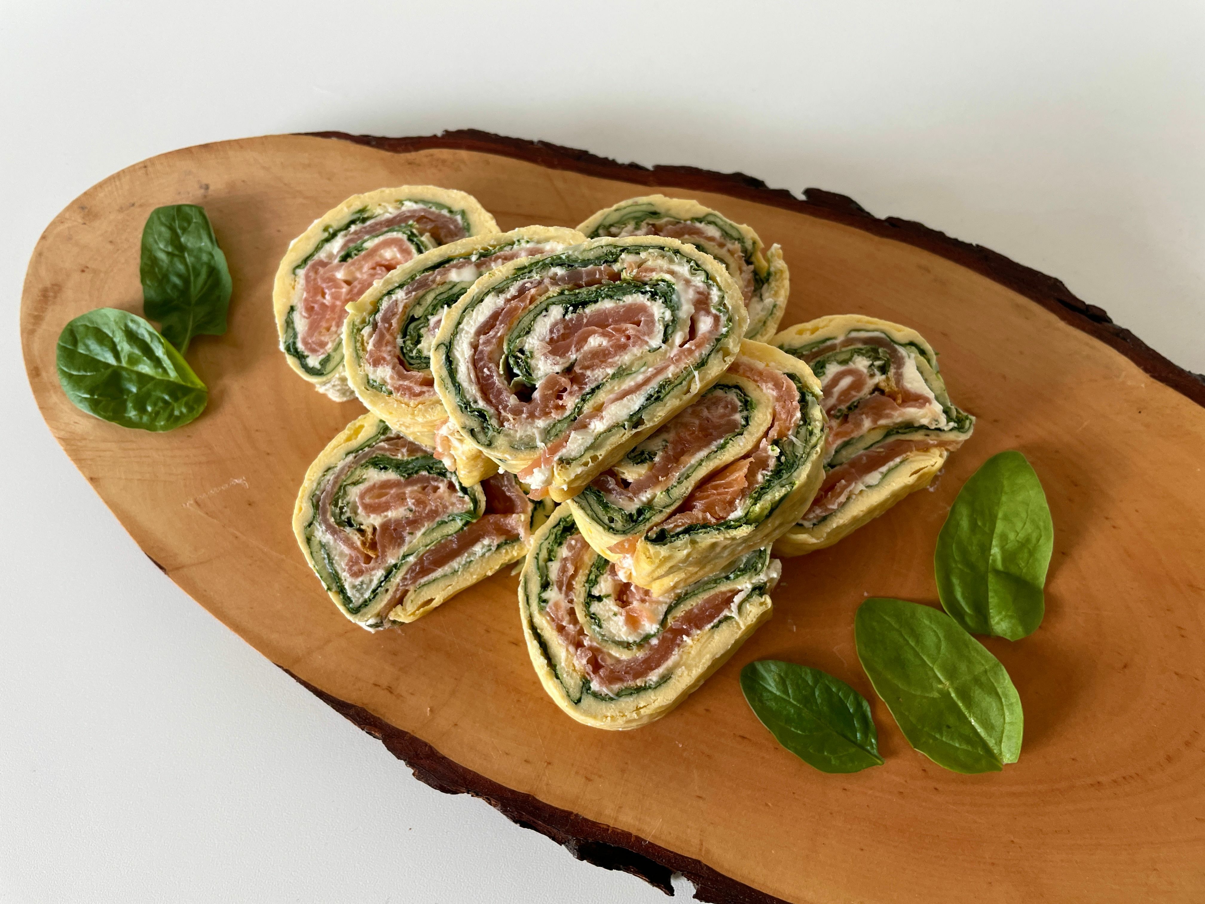 Zutaten für eine Rolle (ca. 15 Stück): 5 Eier, 80 g Babyspinat, 30 g Streukäse, 200 g Frischkäse, 150 g Räucherlachs, Meerrettich, Salz, Pfeffer