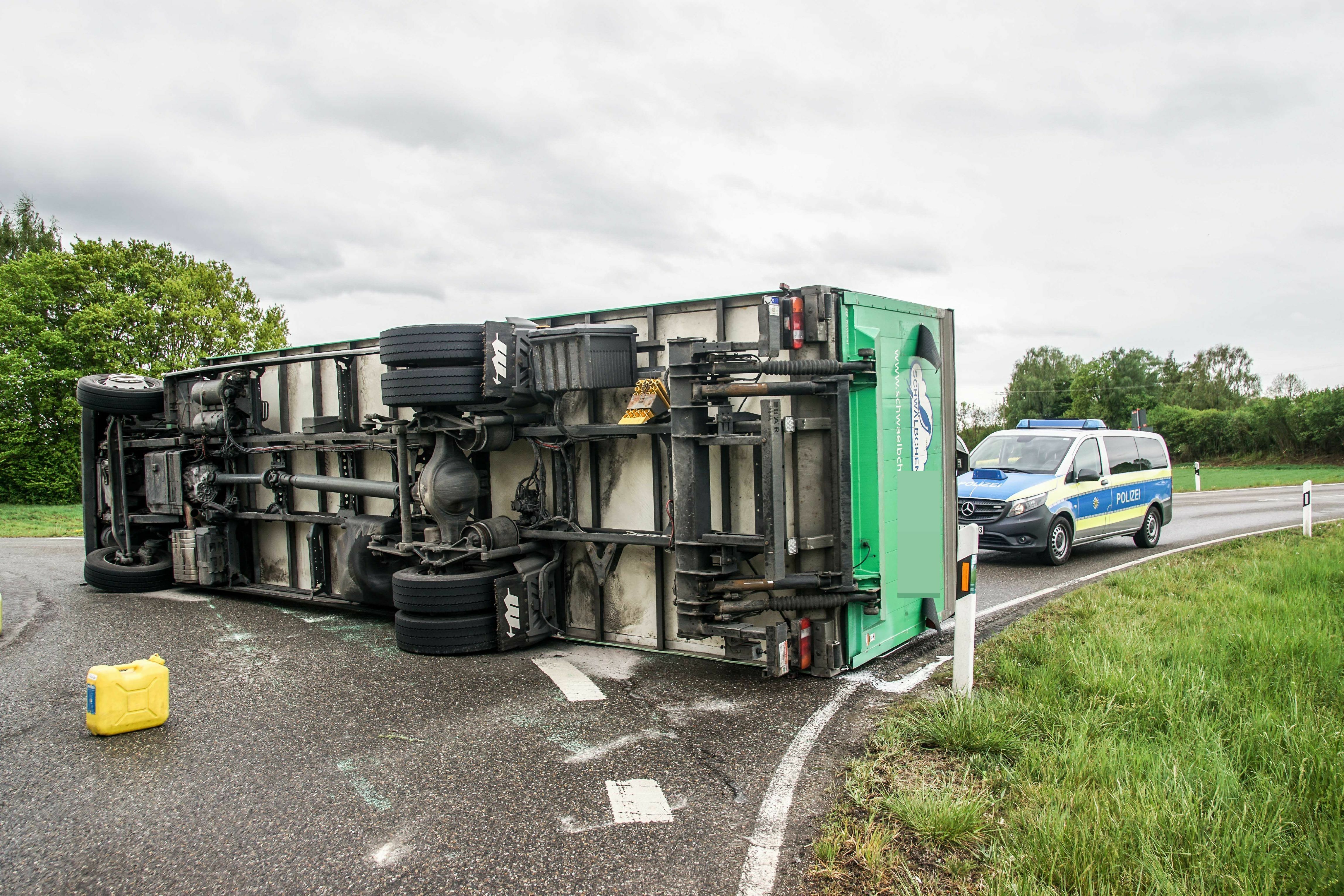 Sachschaden von rund 35.000 Euro ist die Bilanz eines Unfalls, der sich am Donnerstag gegen 8.30 Uhr im Kreisverkehr der Kreisstraßen 1036 und 1039 bei Herrenberg-Gültstein ereignete. Ein 57 Jahre alter Lastwagen-Fahrer wollte den Kreisverkehr von der Einsteinstraße kommend befahren und in Richtung Altingen ausfahren. Vermutlich aufgrund unangepasster Geschwindigkeit kippte der Laster, der knapp vier Tonnen Tiefkühlkost geladen hatte, beim Befahren des Kreisverkehrs auf die rechte Seite. Der 57-jährige Fahrer blieb unverletzt. Während der Unfallaufnahme und der Bergemaßnahmen musste die Kreisstraße 1036 bis gegen 11 Uhr gesperrt werden. Eine örtliche Umleitung wurde eingerichtet. Ausgelaufene Betriebsstoffe wurden durch die Freiwillige Feuerwehr Herrenberg, die mit zehn Einsatzkräften und drei Fahrzeugen vor Ort war, und die Straßenmeisterei Herrenberg beseitigt. Der Lkw war nicht mehr fahrbereit und musste abgeschleppt werden (Bild: SDMG / Dettenmeyer).