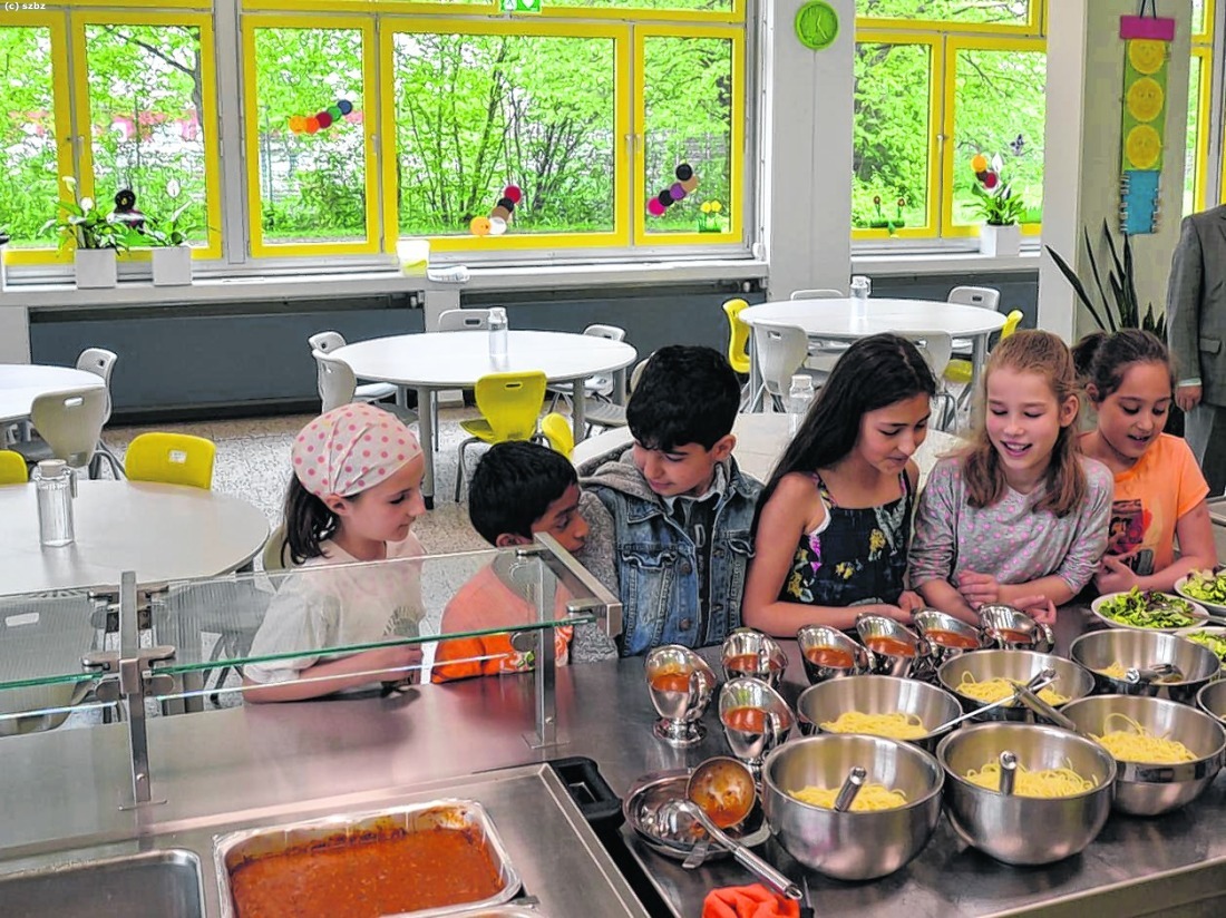 Raupen und Tulpen aus Papier kleben an den Fenstern, in der Ecke steht ein Bücherregal. Gerade ist es noch ruhig, die Küchenhilfe richtet Salat und Pudding her. Gleich wird es lauter, wenn die erste Schicht ...