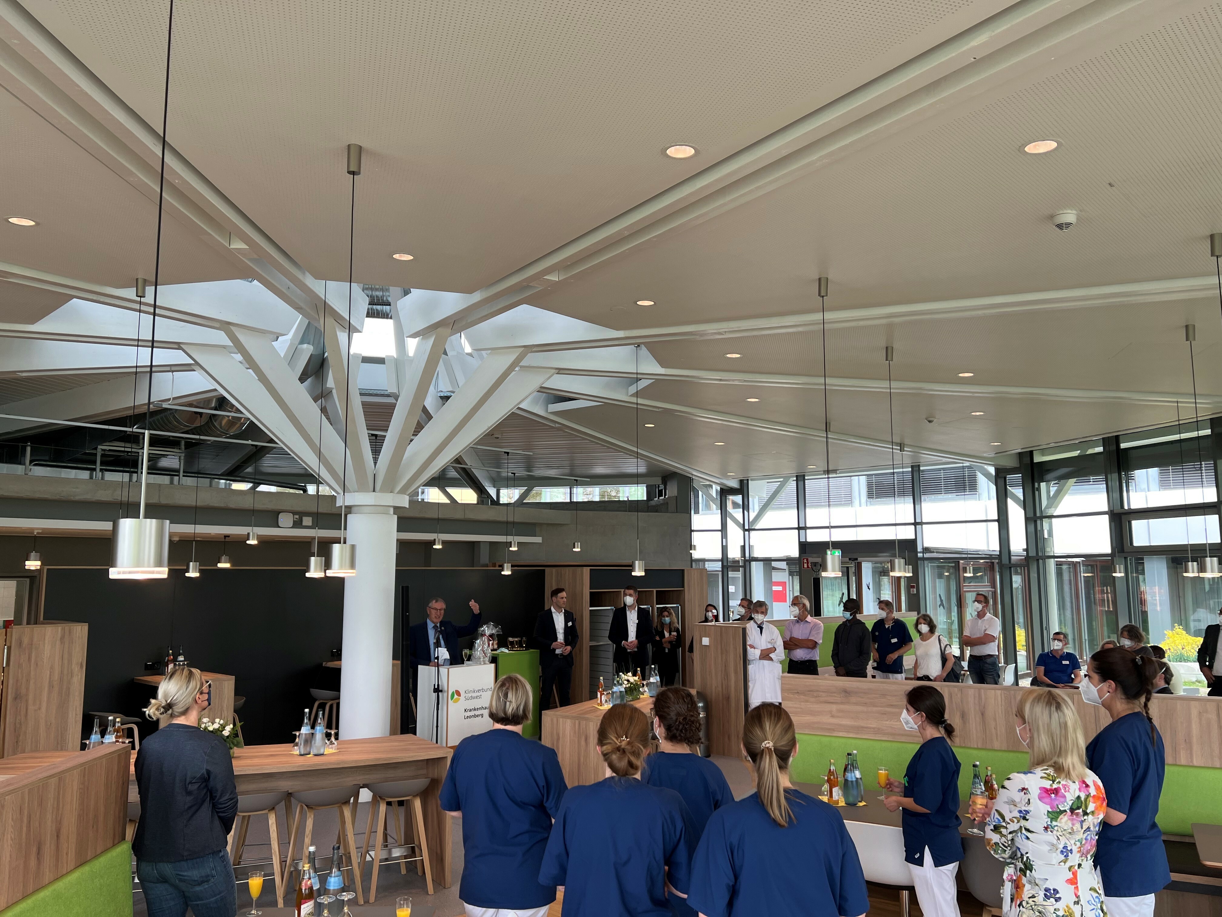 „Der neue Pavillon ist integraler Bestandteil der rund 87 Millionen-Investition in den Standort Leonberg. Er ist ein Schmuckstück und Markenzeichen: ein funktionell, energetisch und architektonisch rundum gelungener Bau. Nach zwei Jahren provisorischer Cafeteria im Untergeschoss und parallel zwei Jahren Pandemie haben die Mitarbeiterinnen und Mitarbeiter des Krankenhauses diese kulinarische Rückzugsoase mehr als verdient“, betonte Roland Bernhard und sieht die rund 4 Millionen Euro an Baukosten gut angelegt.