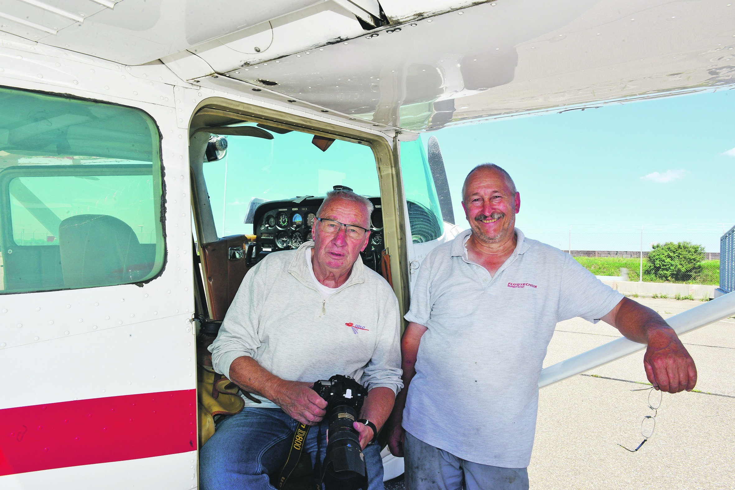Der langjährige SZ/BZ-Fotograf Friedrich Stampe (links) war für die Serie „Früher und heute: Wir zeigen den Landkreis von oben“ im Flieger unterwegs. Unser Foto zeigt ihn an der Seite von Pilot Thomas Holzhäuser vom Flugsportverein Sindelfingen (Bild: z).