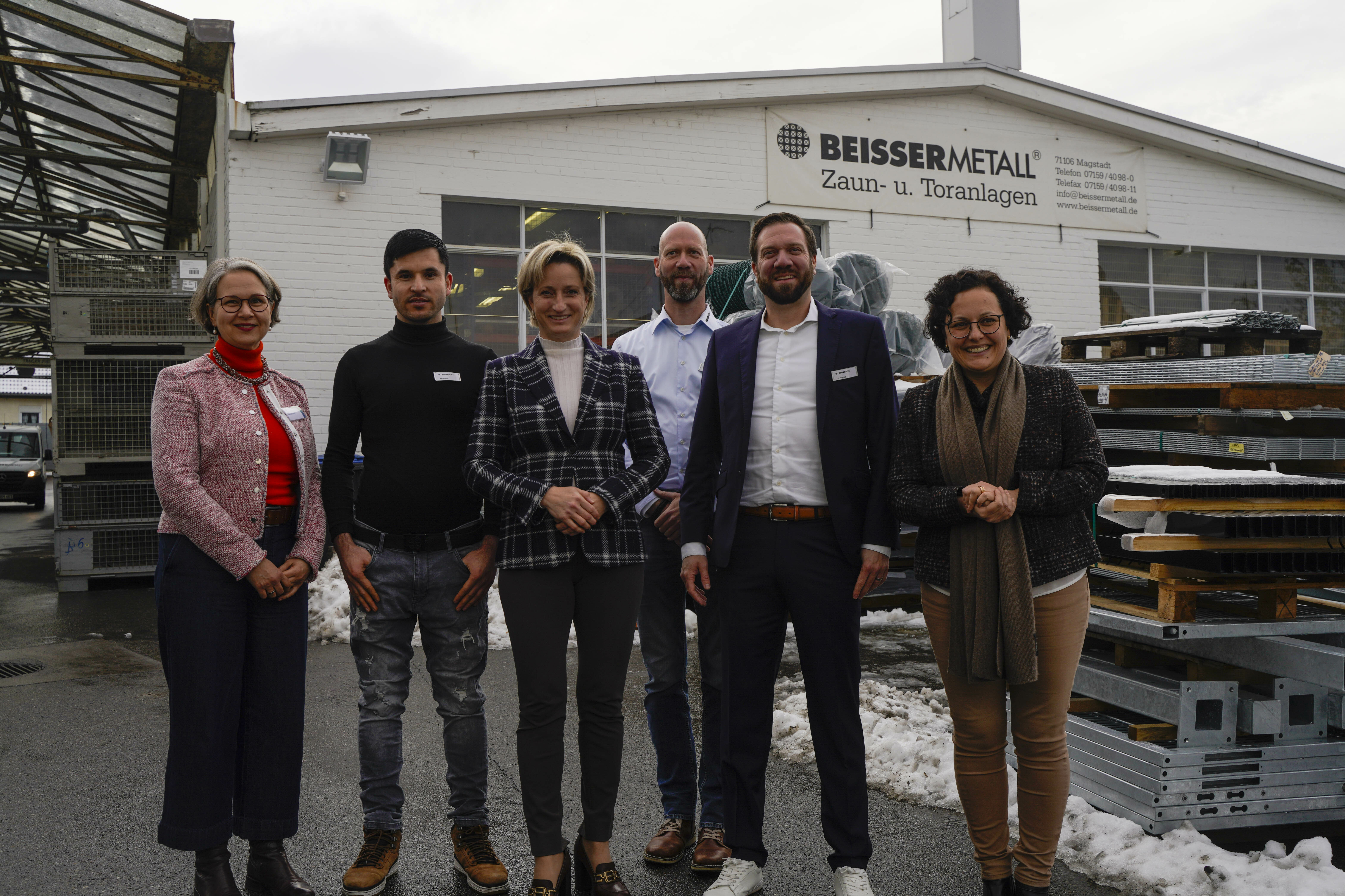 Gemeinsames Gruppenbild bei Beisser Metall (von links): Tanja Laabs, Yousaf Momand, Dr. Nicole Hoffmeister-Kraut, Michael und Jan Pogadl und Marion Oker.