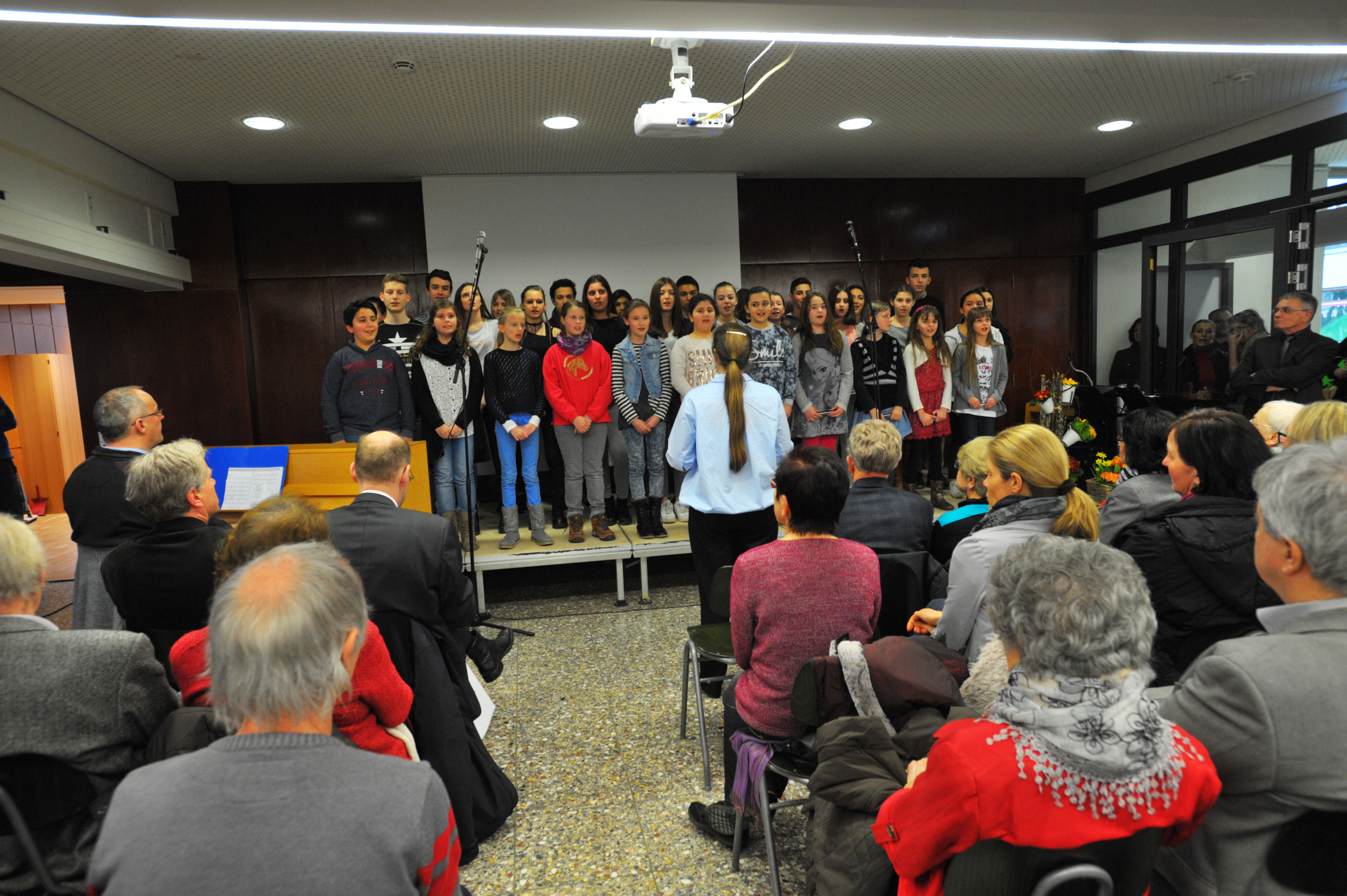 Der Schulchor der Realschule Klostergarten macht bei der offiziellen Einweihung den Anfang. Ganz rechts steht Rektor Hans Grau.	Bild: Stampe