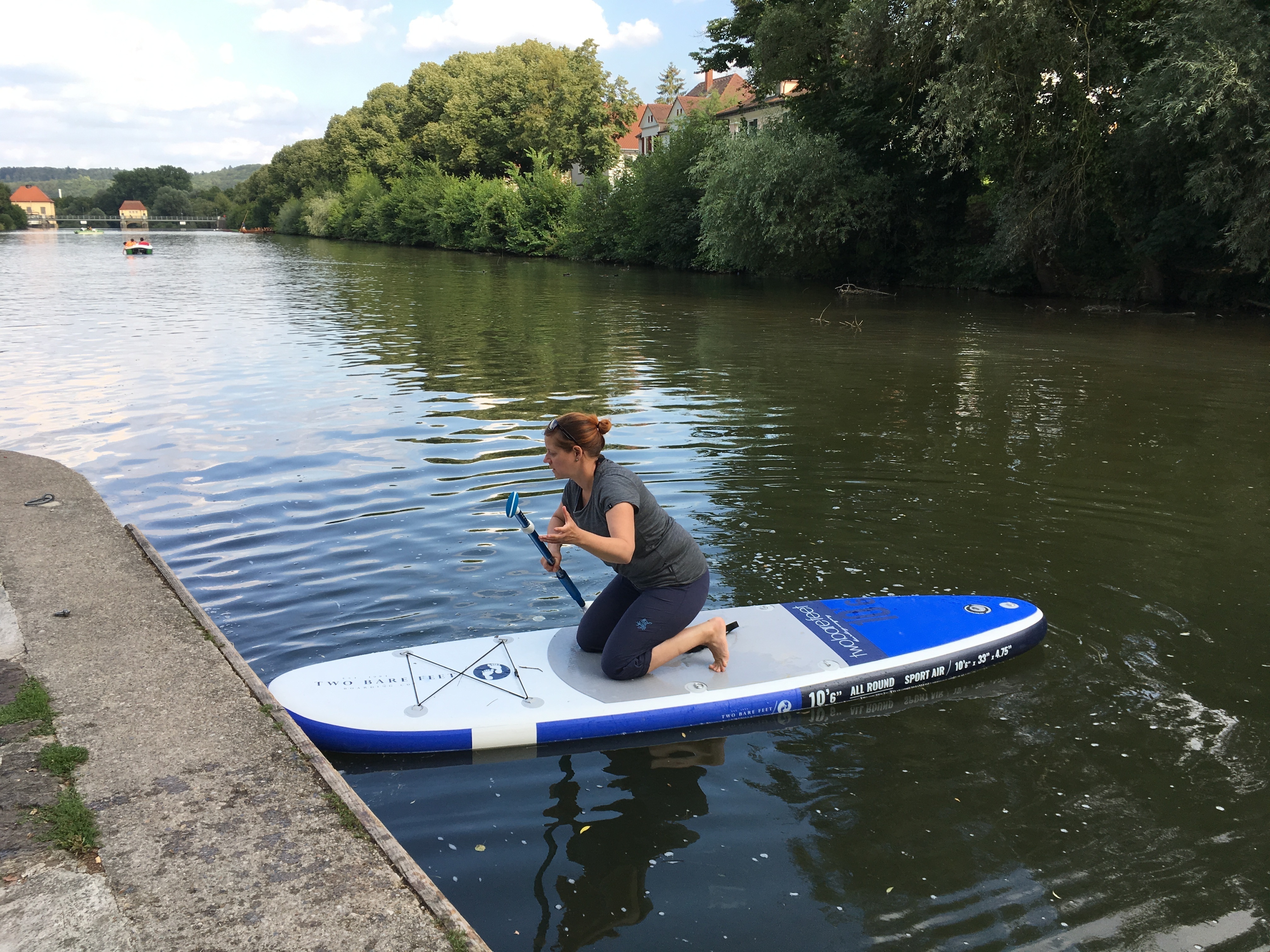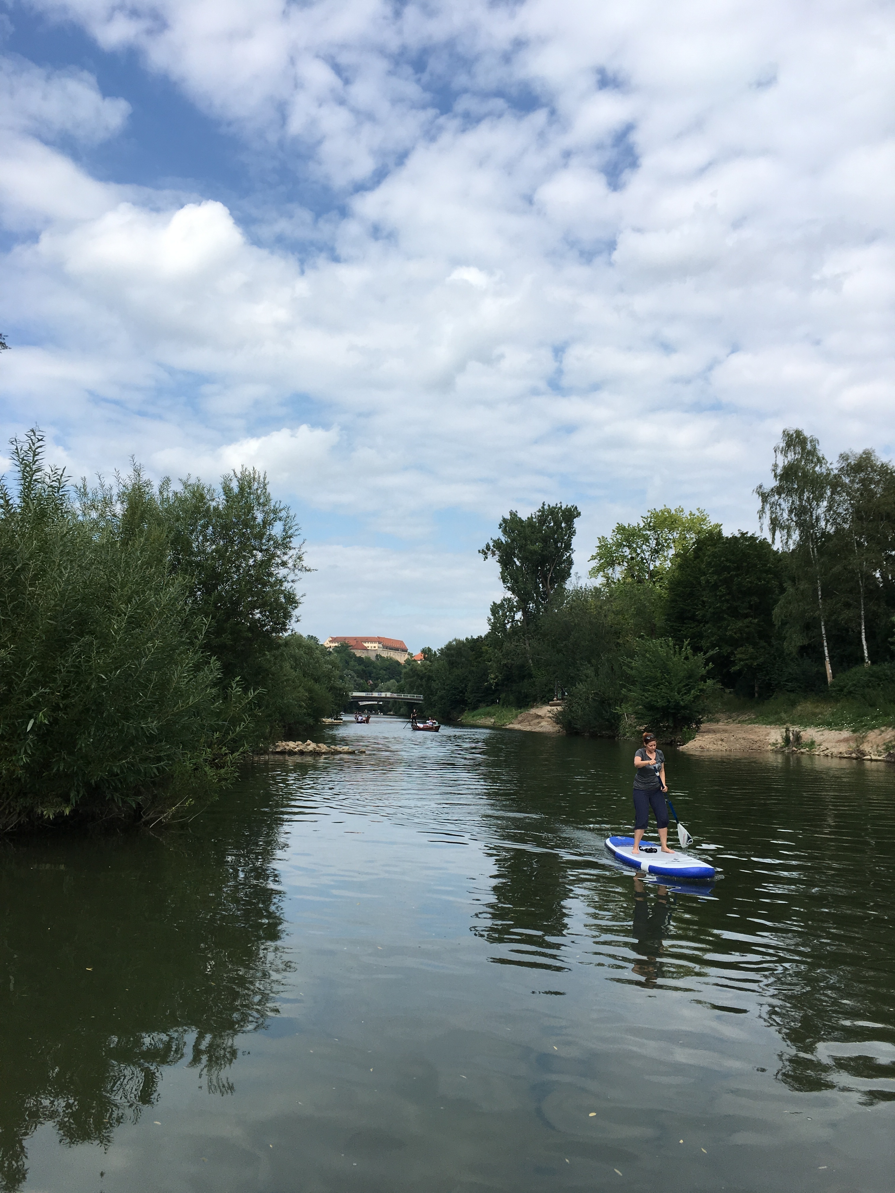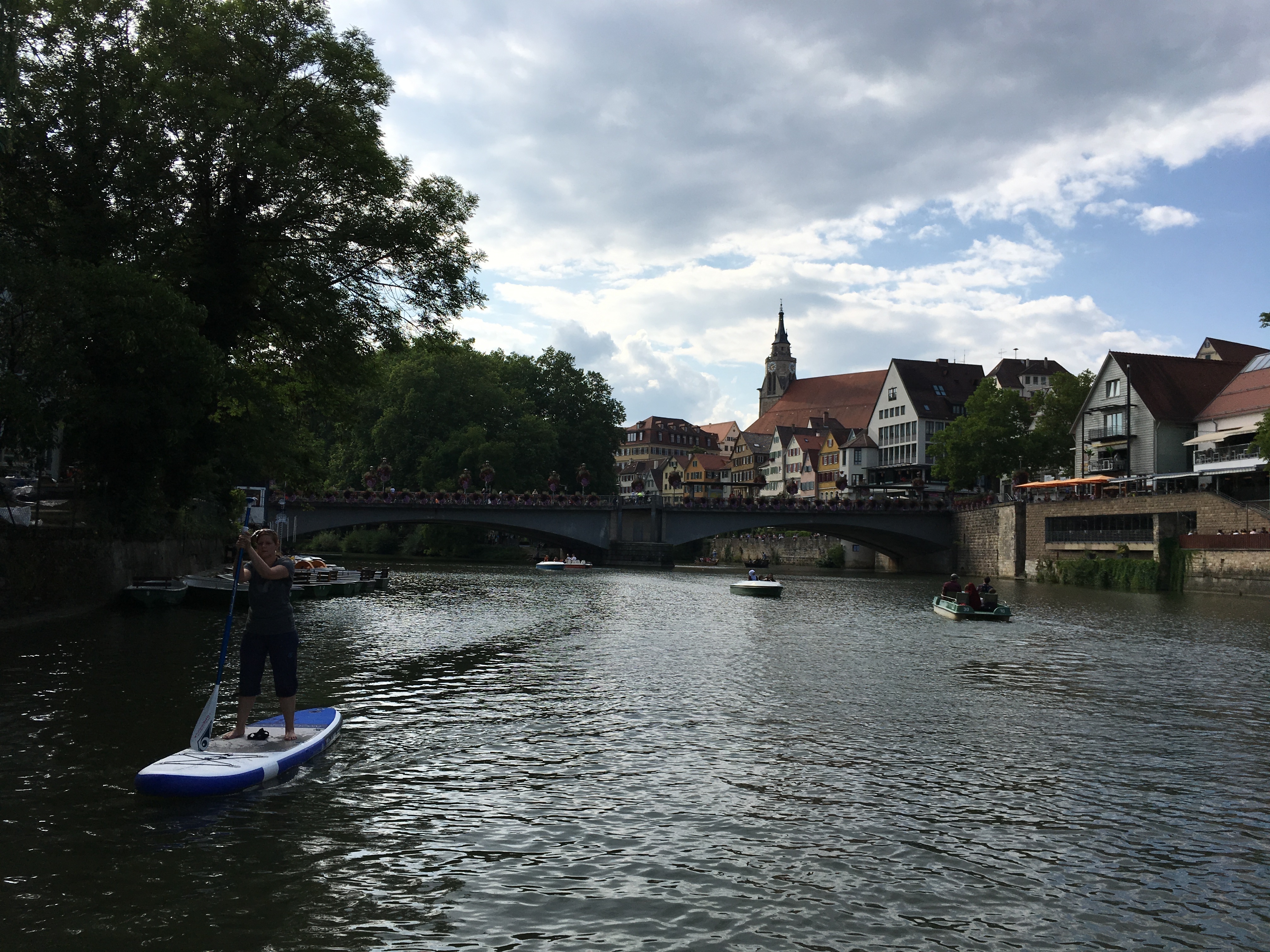 Zugegeben, es gibt ruhigere Gewässer für einen SUP-Ausflug als den Neckar in Tübingen an einem Sommerwochenende. Dafür gibt es rund um die Neckarinsel auf und neben dem Wasser eine Menge zu sehen. Neben der attraktiven Altstadt zum Beispiel die traditionellen Stocherkähne mit ihren illustren Mitfahrern.